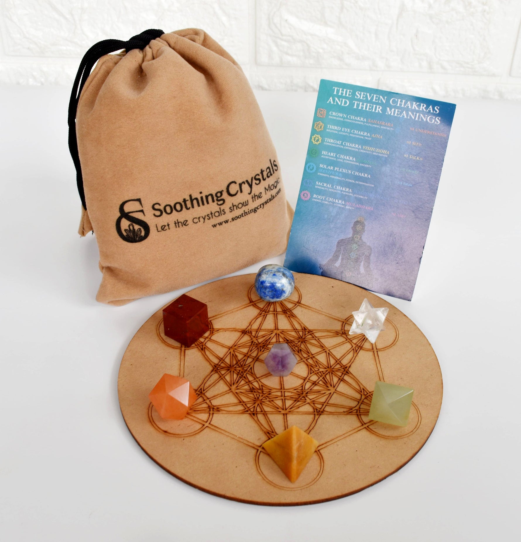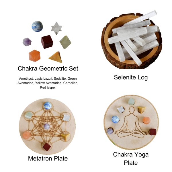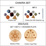 Chakra Crystals Geometric Set, 7 Chakra Plato Stones with Wooden Grid Plate, Selenite Log