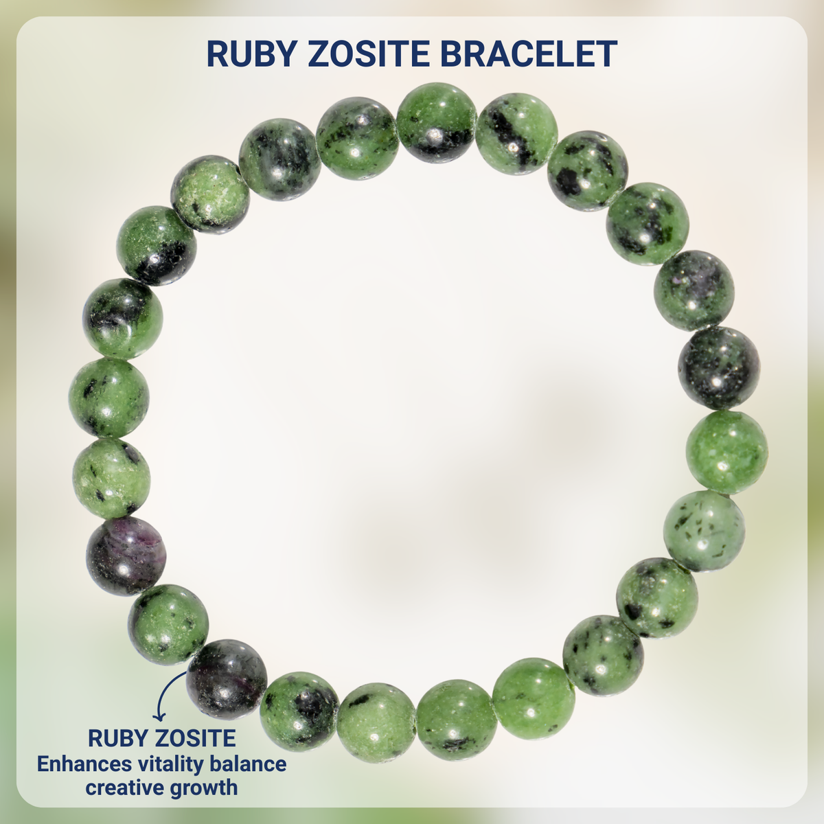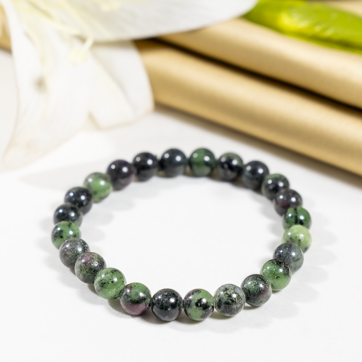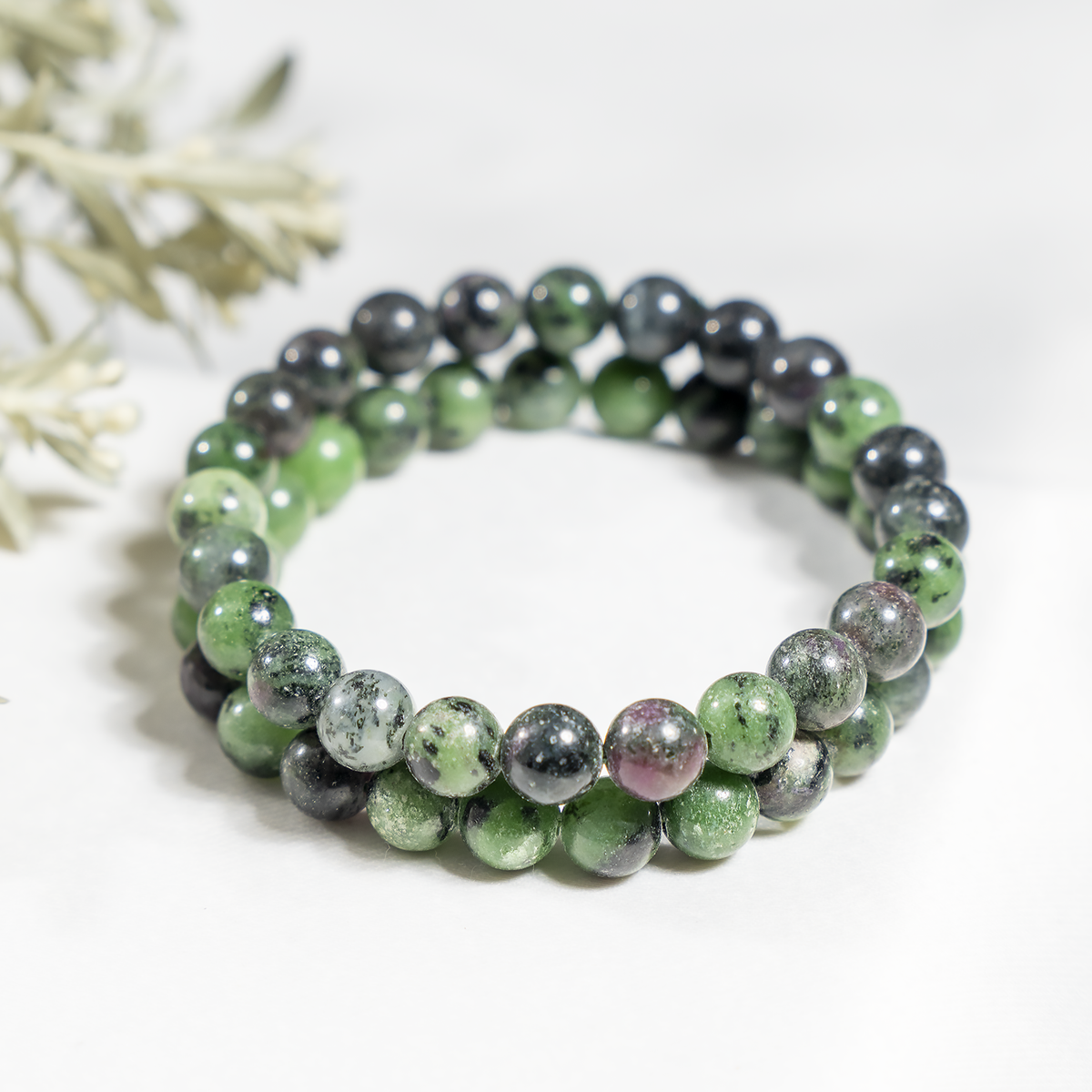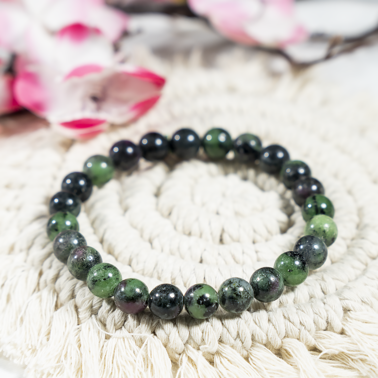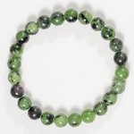 A vibrant bracelet crafted with natural Ruby Zoisite stones, featuring a striking mix of green and red hues. This elegant accessory promotes emotional balance, vitality, and positive energy.