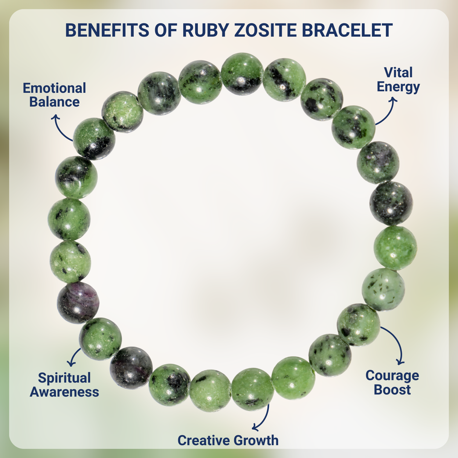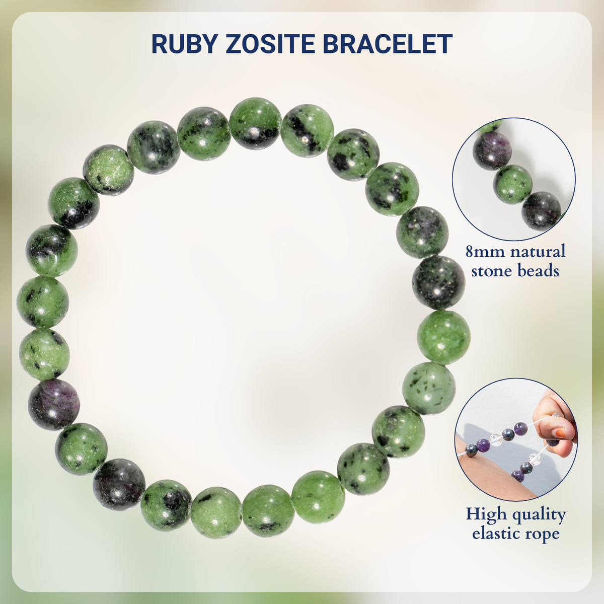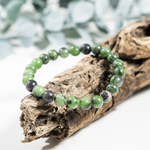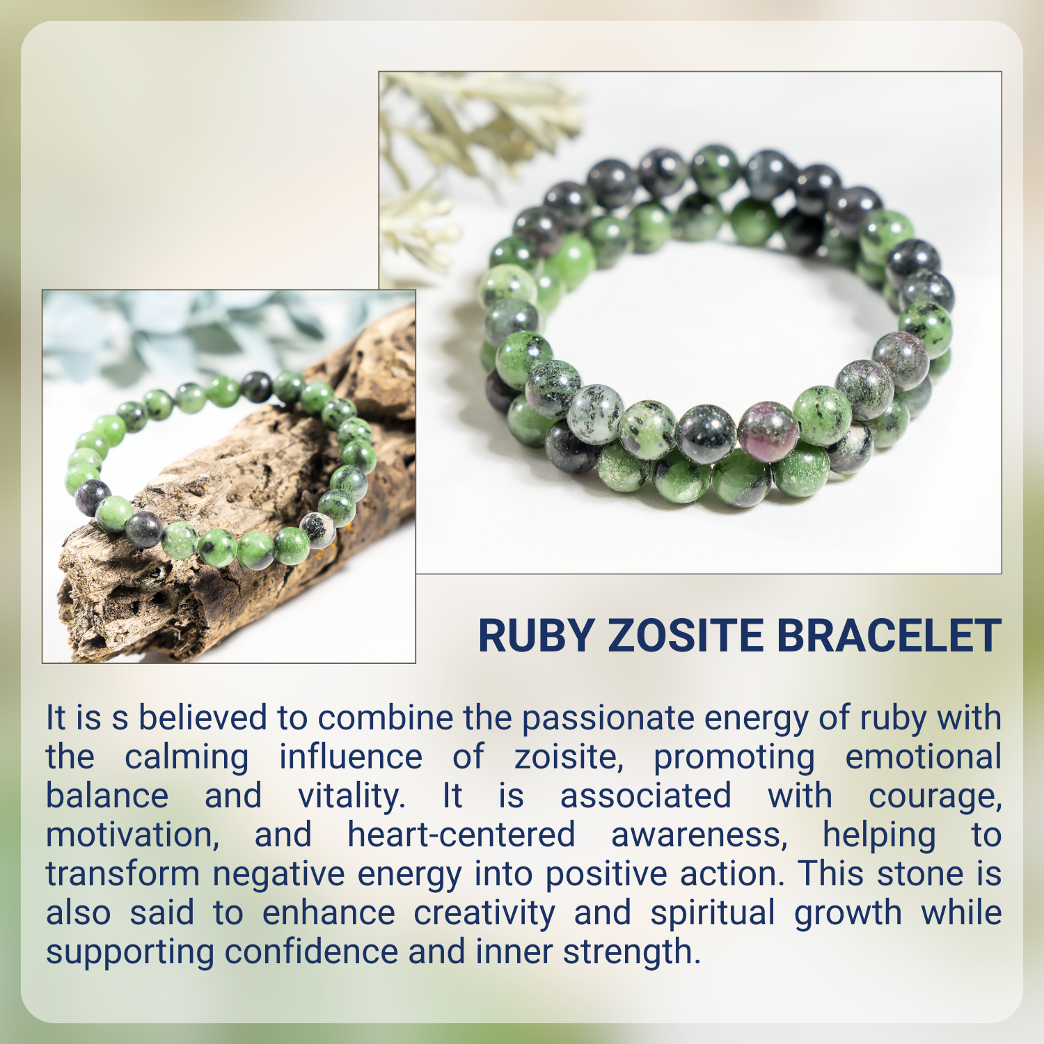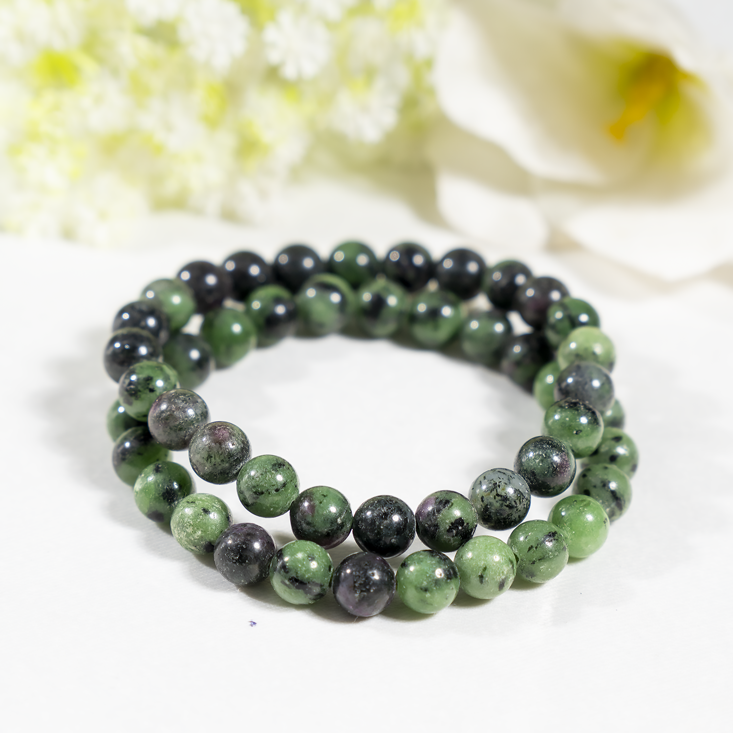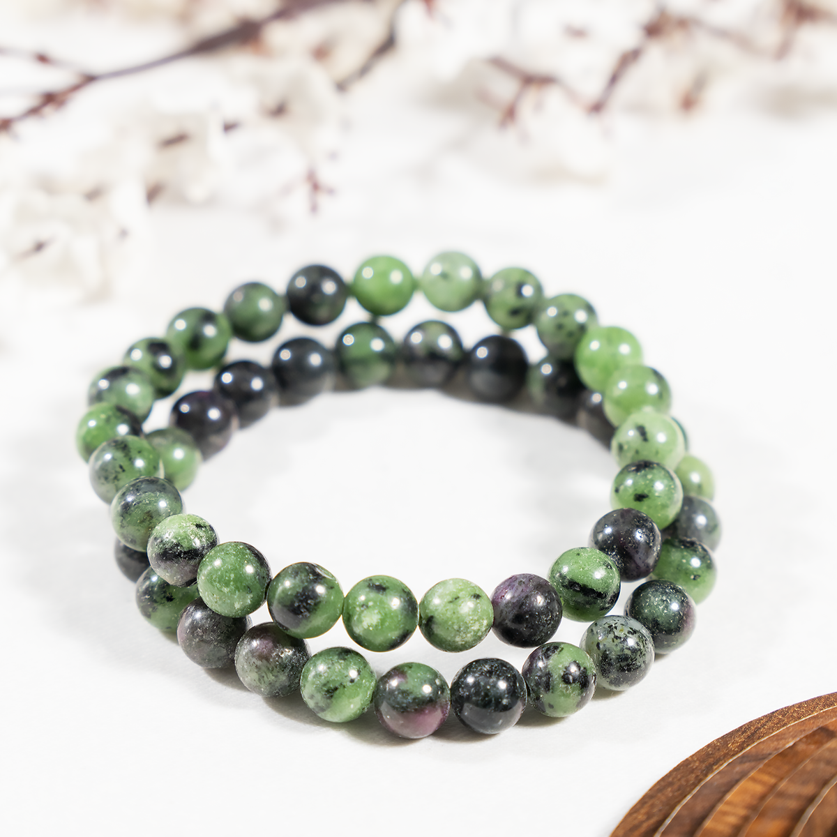 A vibrant bracelet crafted with natural Ruby Zoisite stones, featuring a striking mix of green and red hues. This elegant accessory promotes emotional balance, vitality, and positive energy.