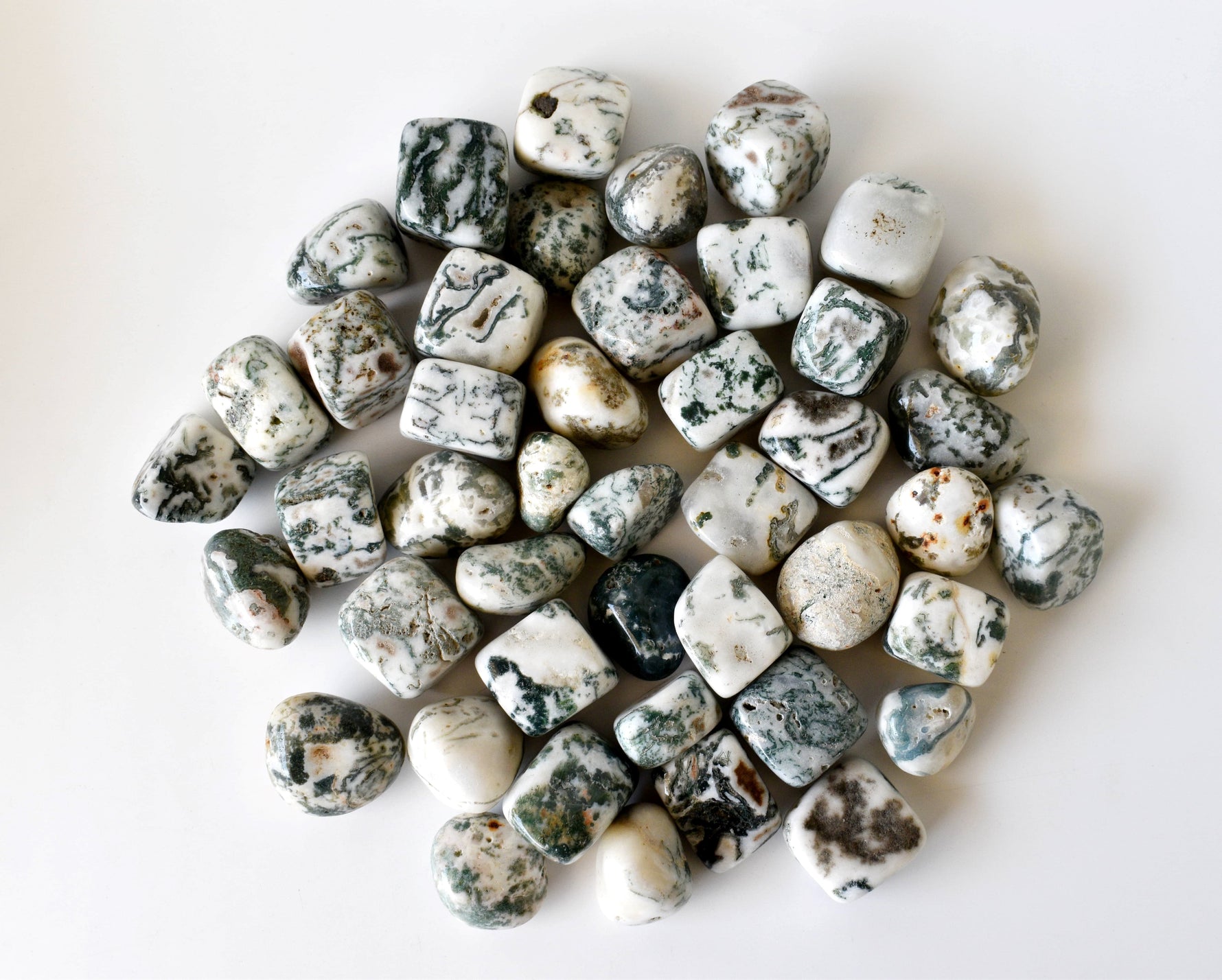 Unit price perππAre you ready to bring energy and peace into your life? Then you are ready for our Tree Agate Tumbled Stone A Grade, Medium Tumbled Crystals! These beautiful stones have a unique combination of earth green hues and tree like shapes that create a powerful grounding tool for you to manifest all of your desires.