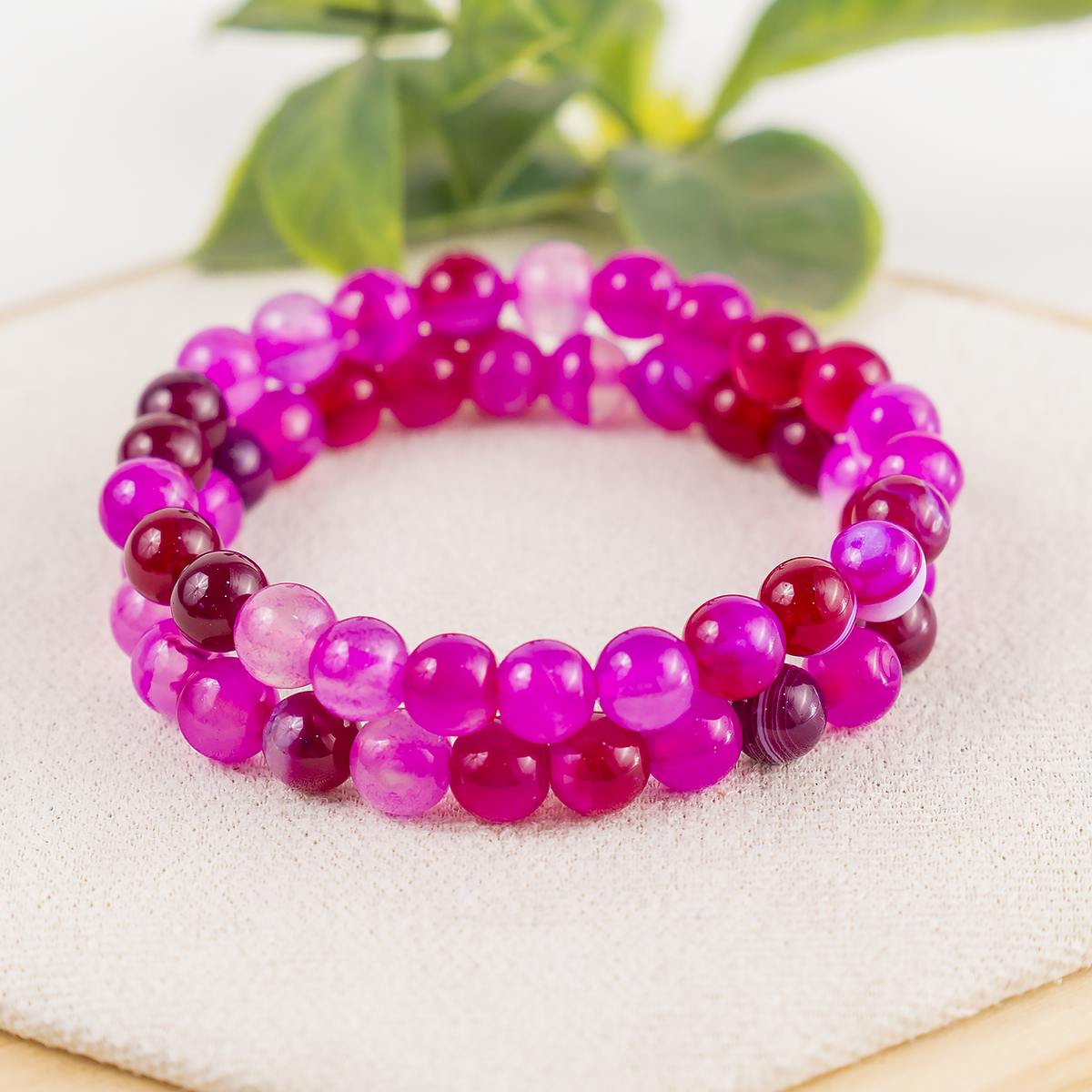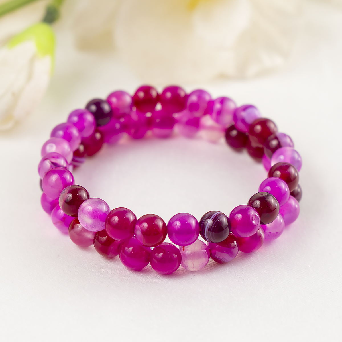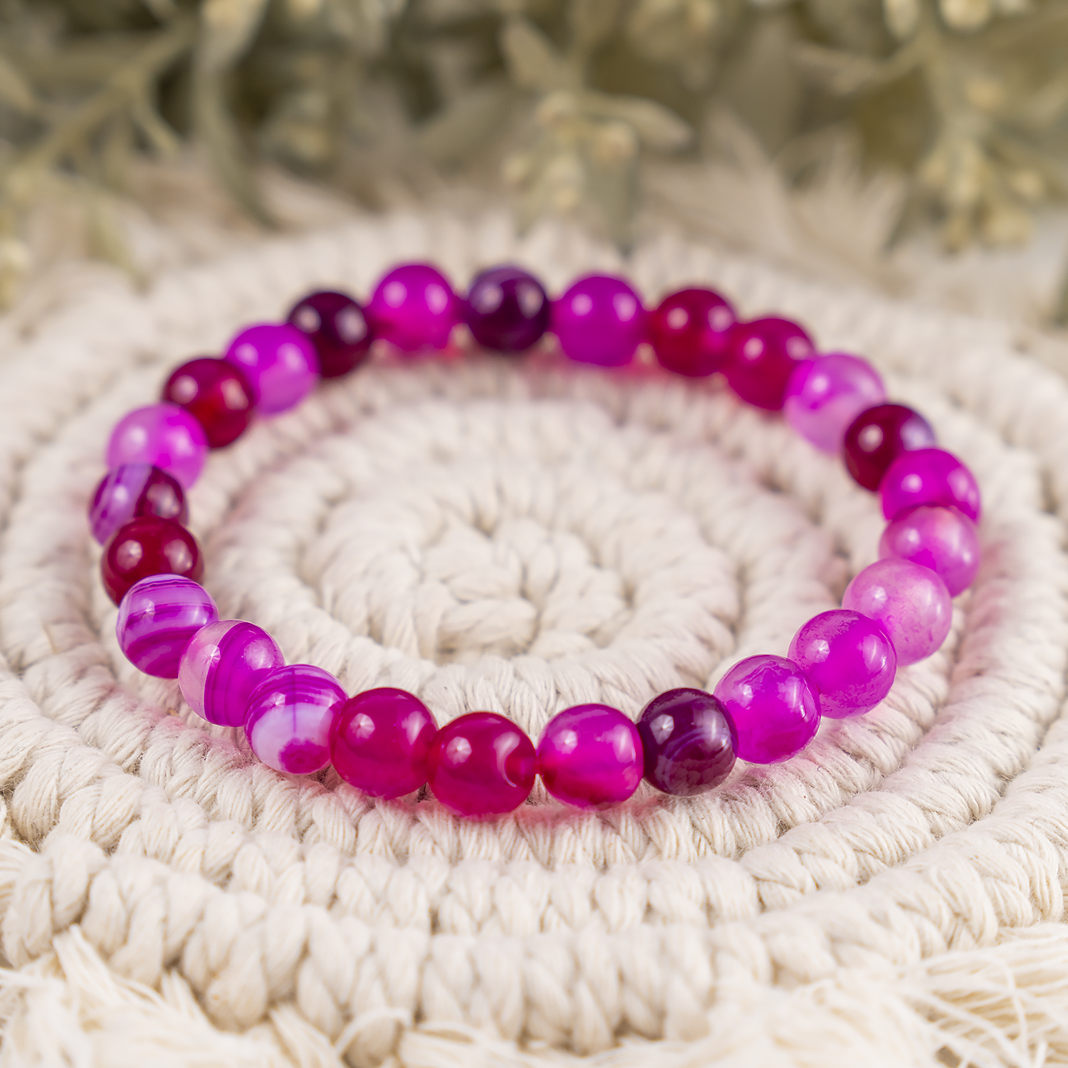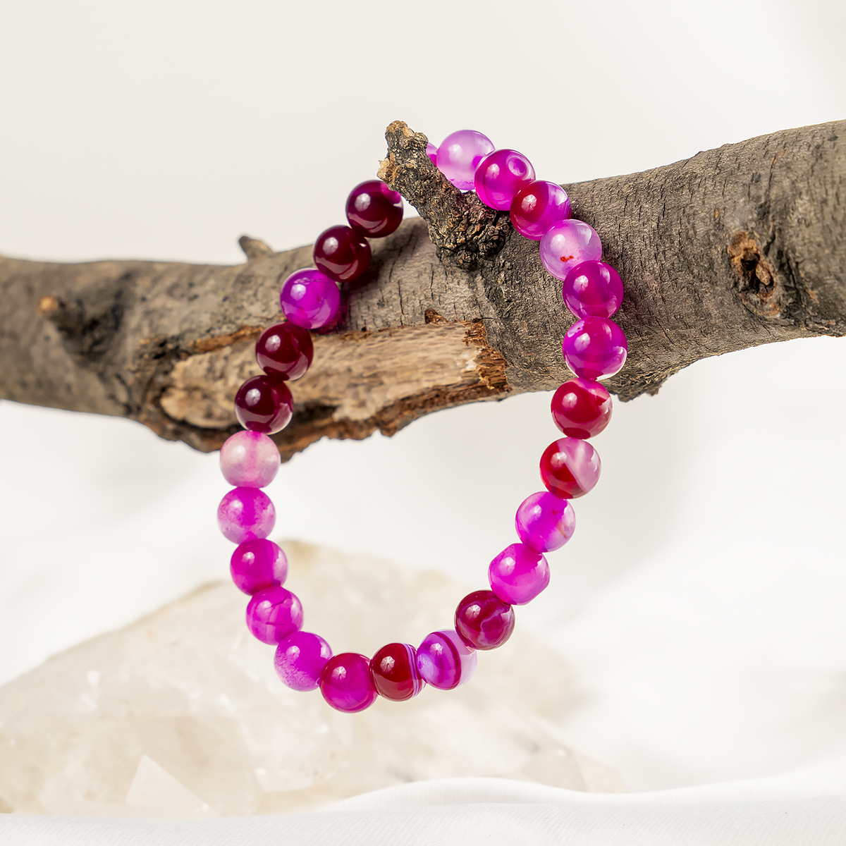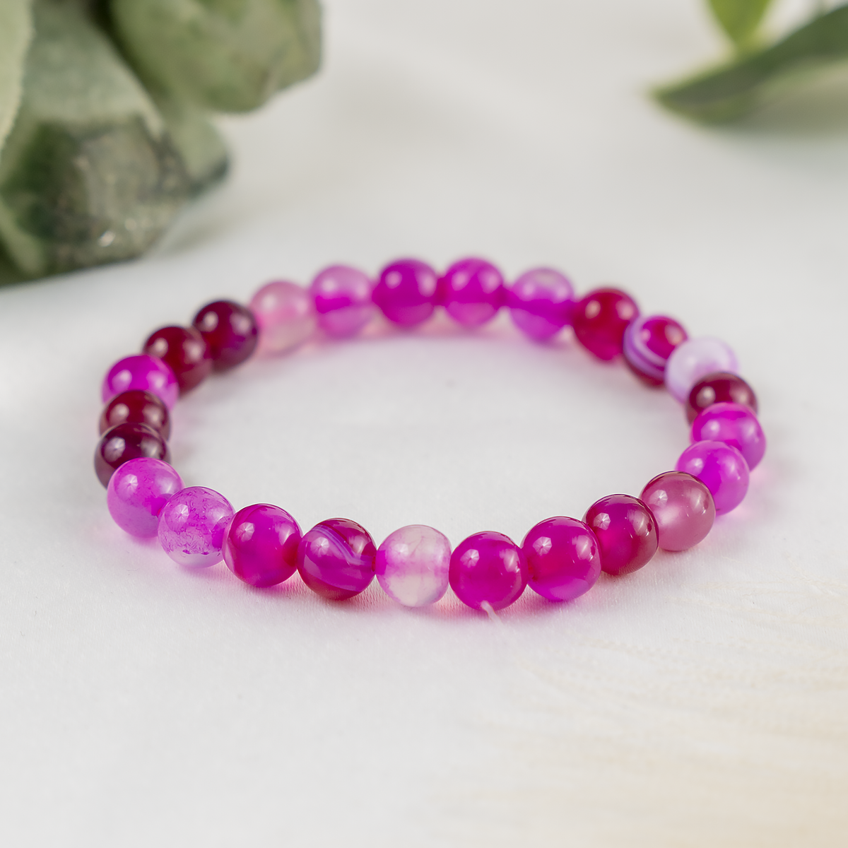 A beautiful bracelet made with smooth, Banded Agate Pink round beads, featuring natural striped patterns and soft, calming tones. Each bracelet is unique due to the stone’s natural variations.