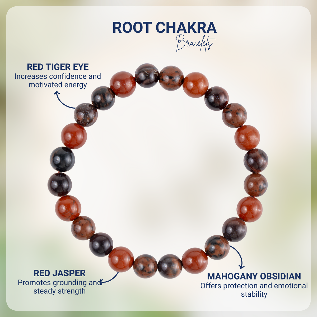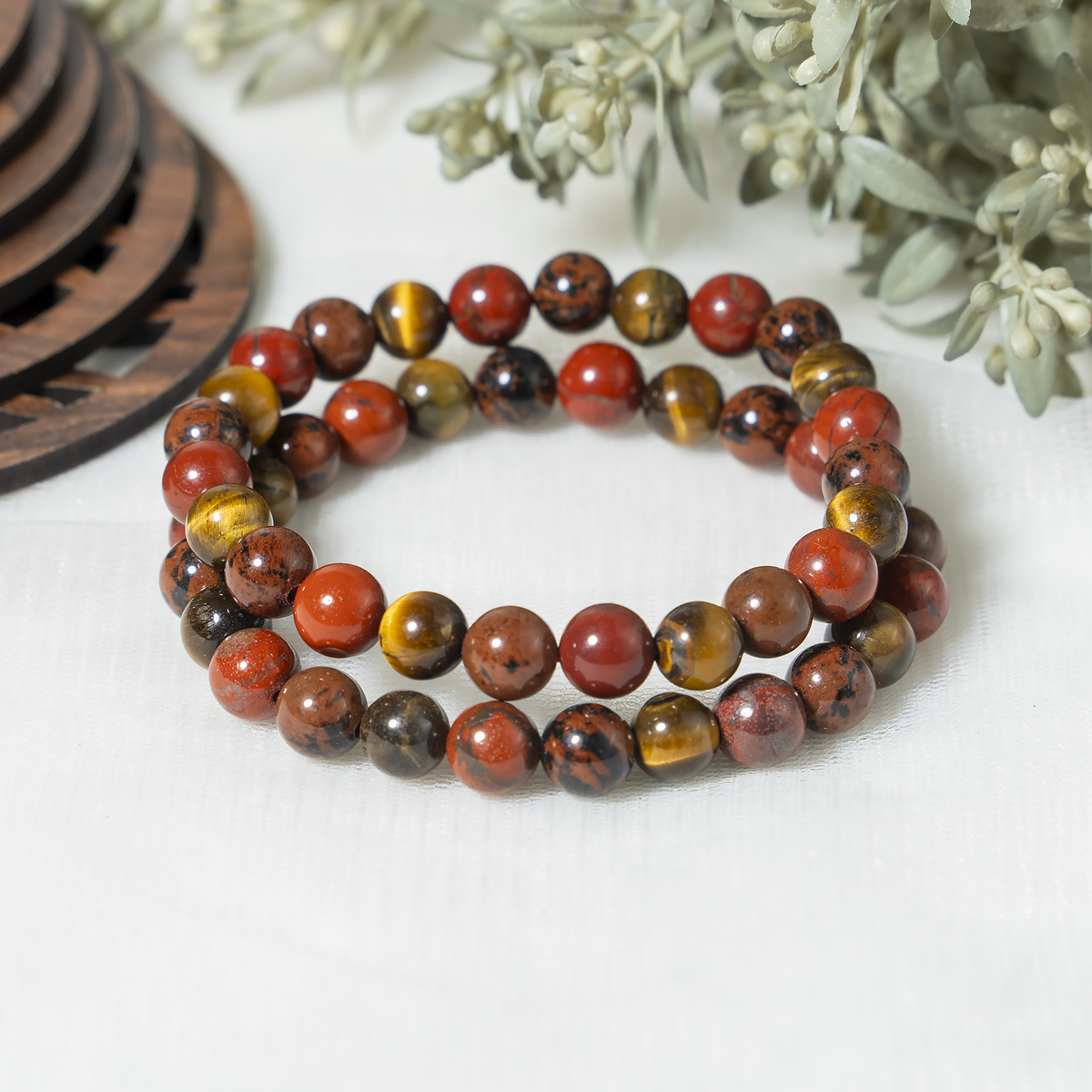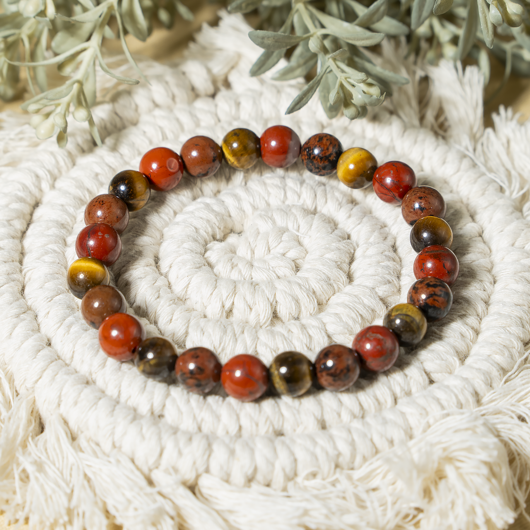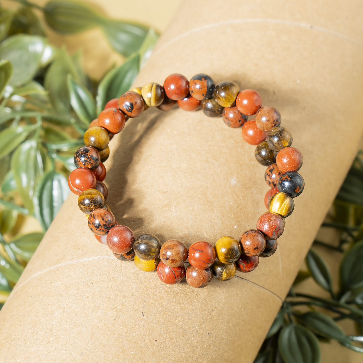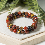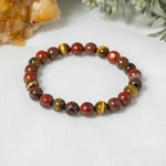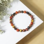 Handcrafted Root Chakra Bracelet made with natural gemstones to promote grounding, stability, and balance. A perfect beaded crystal bracelet for daily wear and energy healing, Featuring Red Jasper, Tiger eye, Mahogany Obsidian crystal known for grounding energy, strength, and protection.