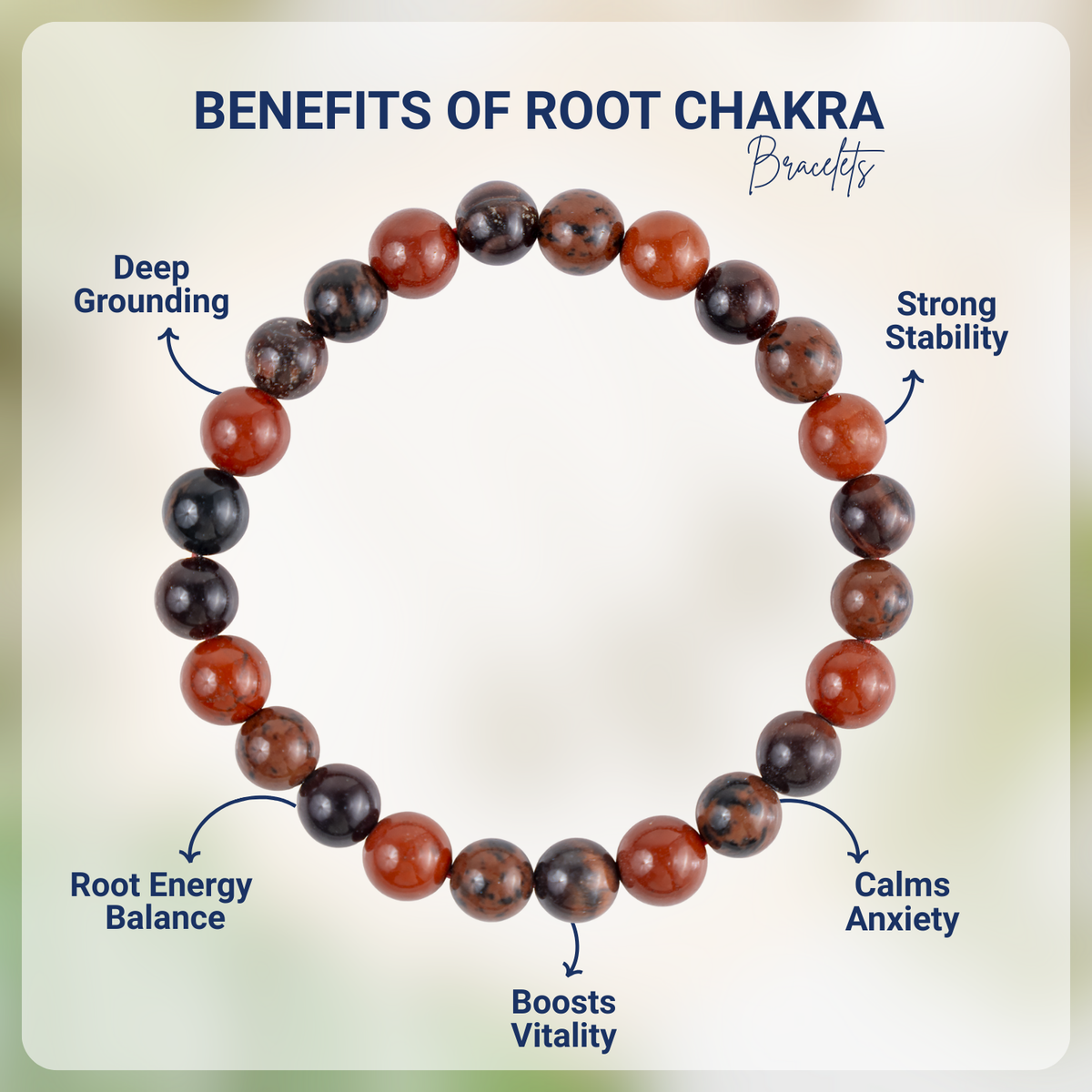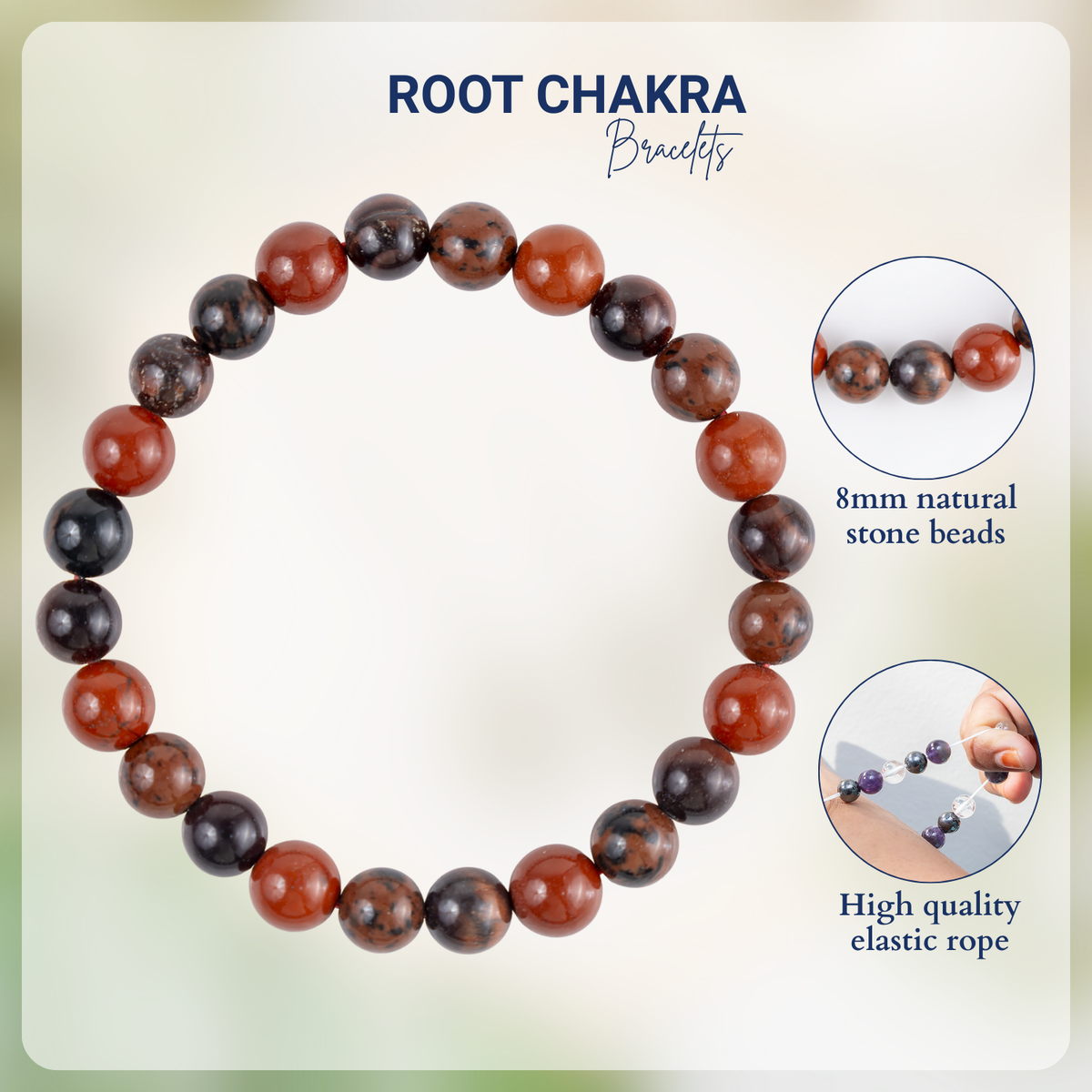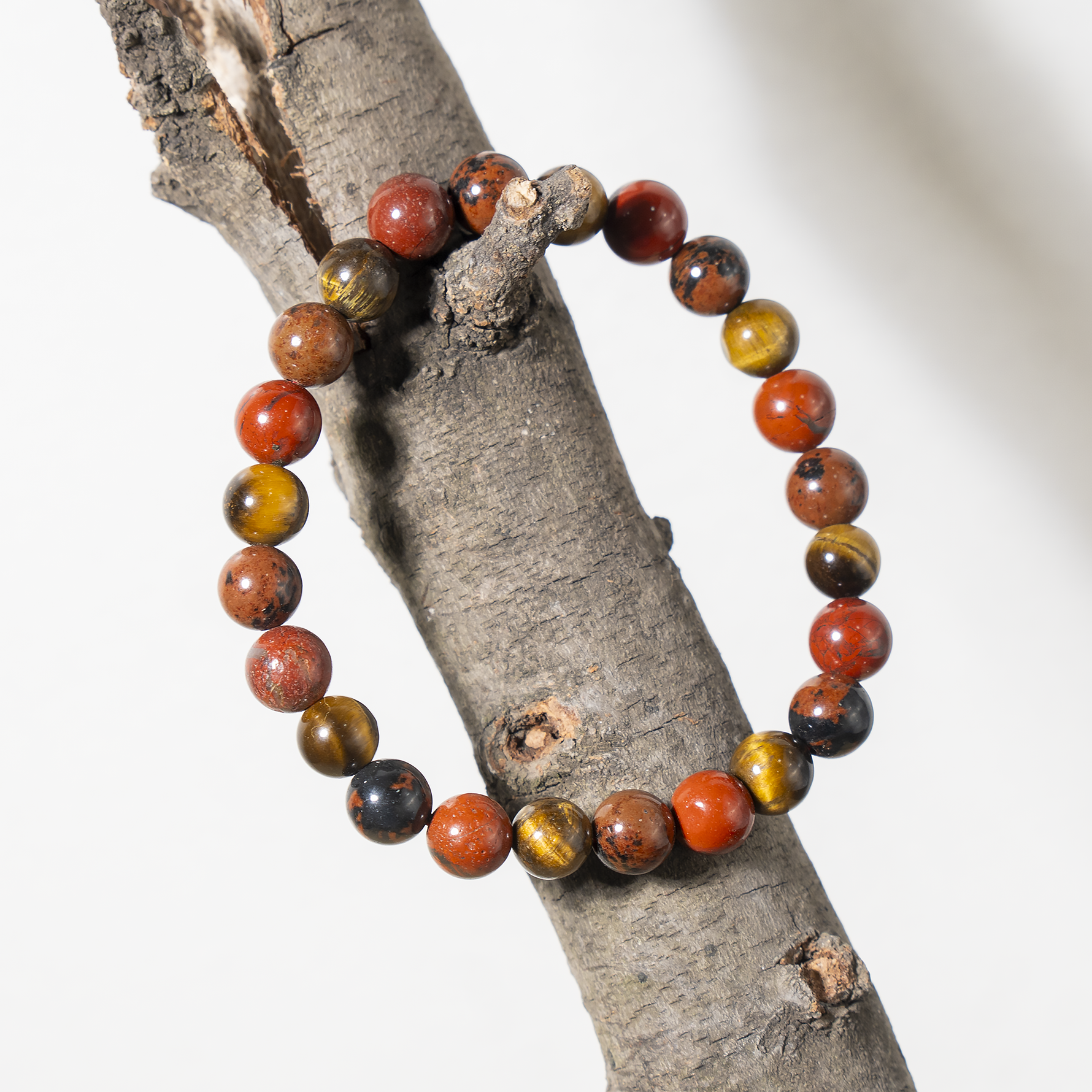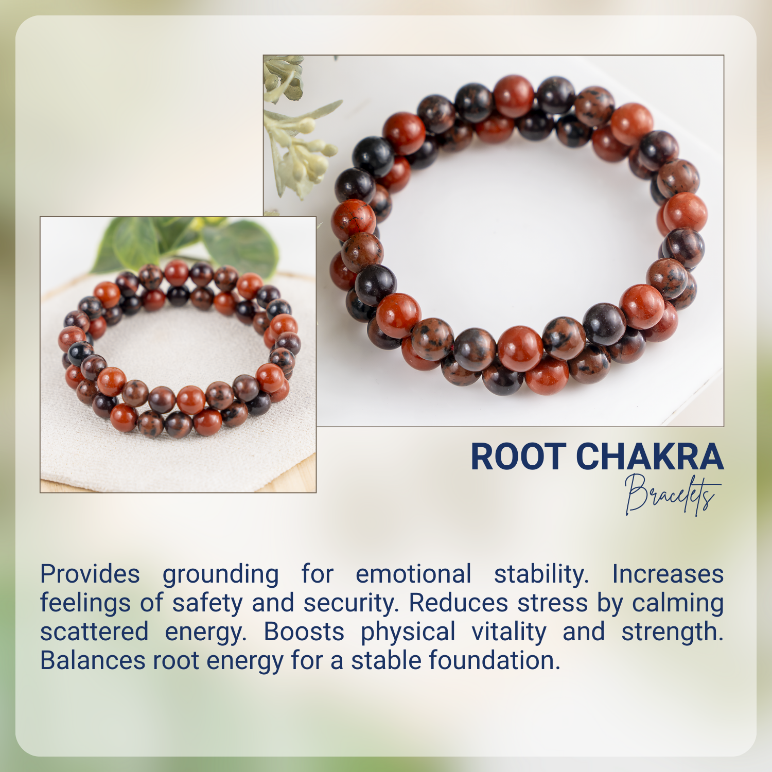 Handcrafted Root Chakra Bracelet made with natural gemstones to promote grounding, stability, and balance. A perfect beaded crystal bracelet for daily wear and energy healing, Featuring Red Jasper, Tiger eye, Mahogany Obsidian crystal known for grounding energy, strength, and protection.