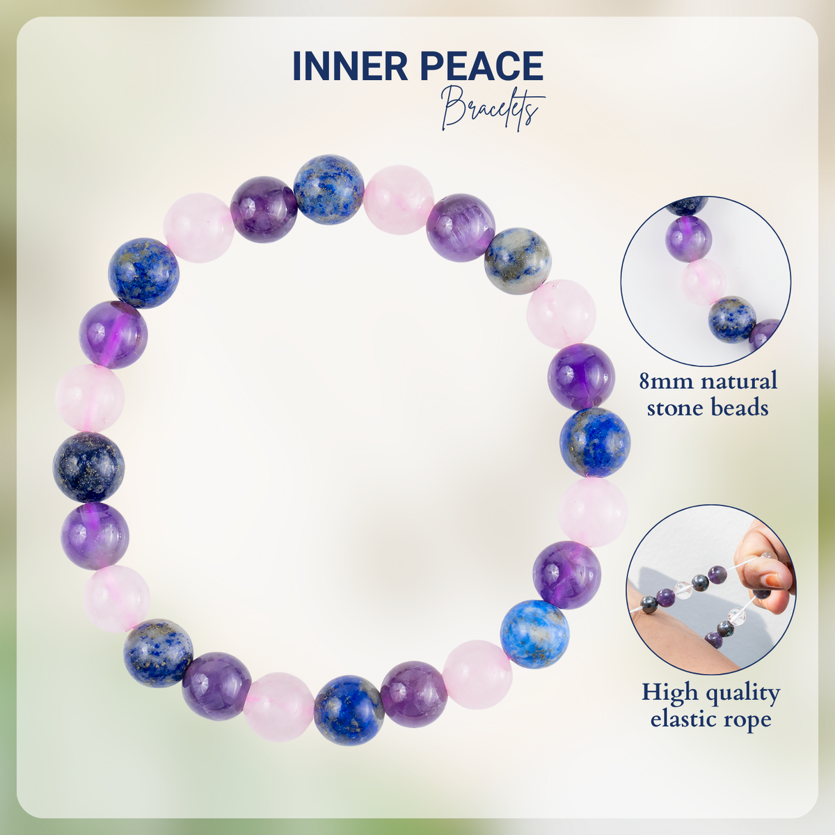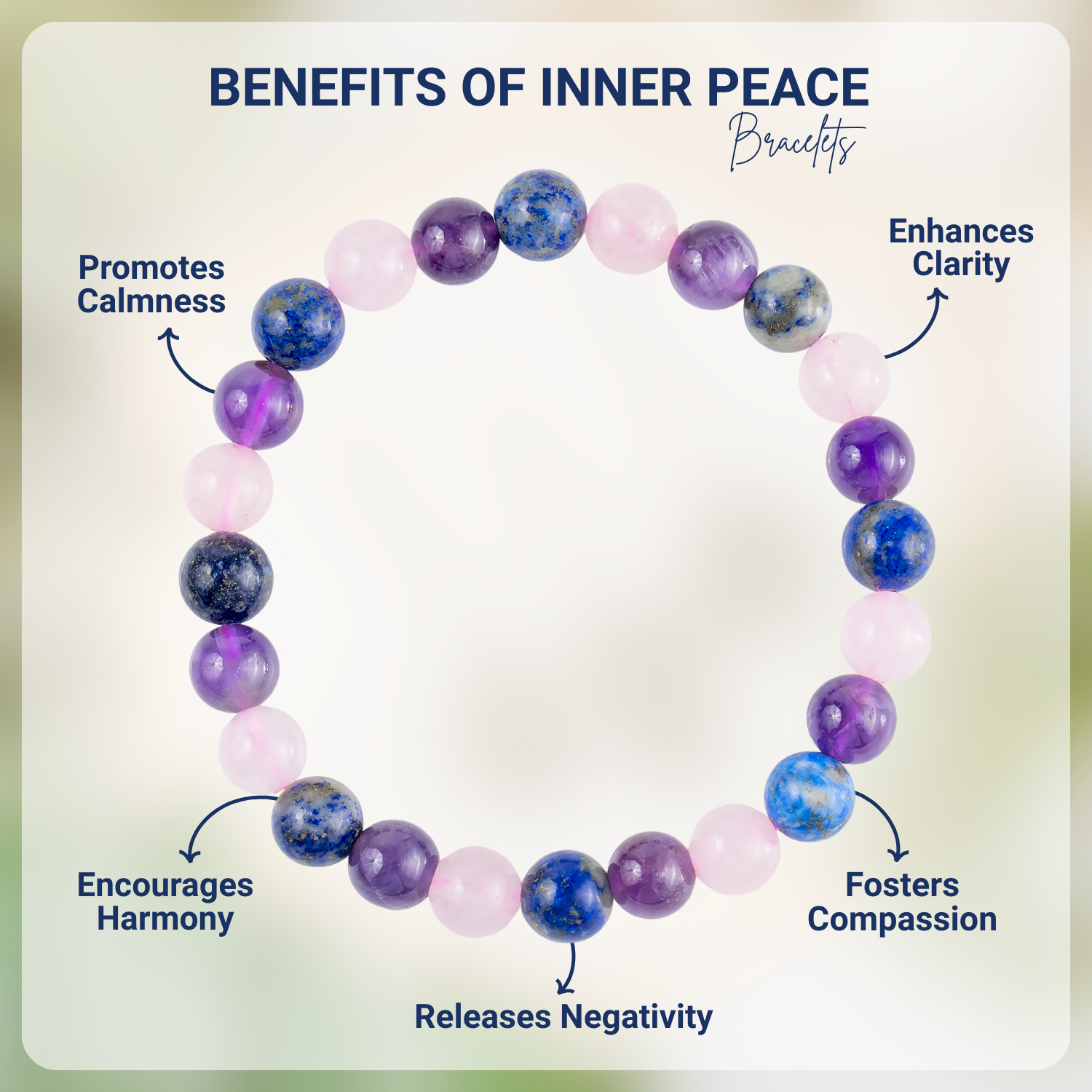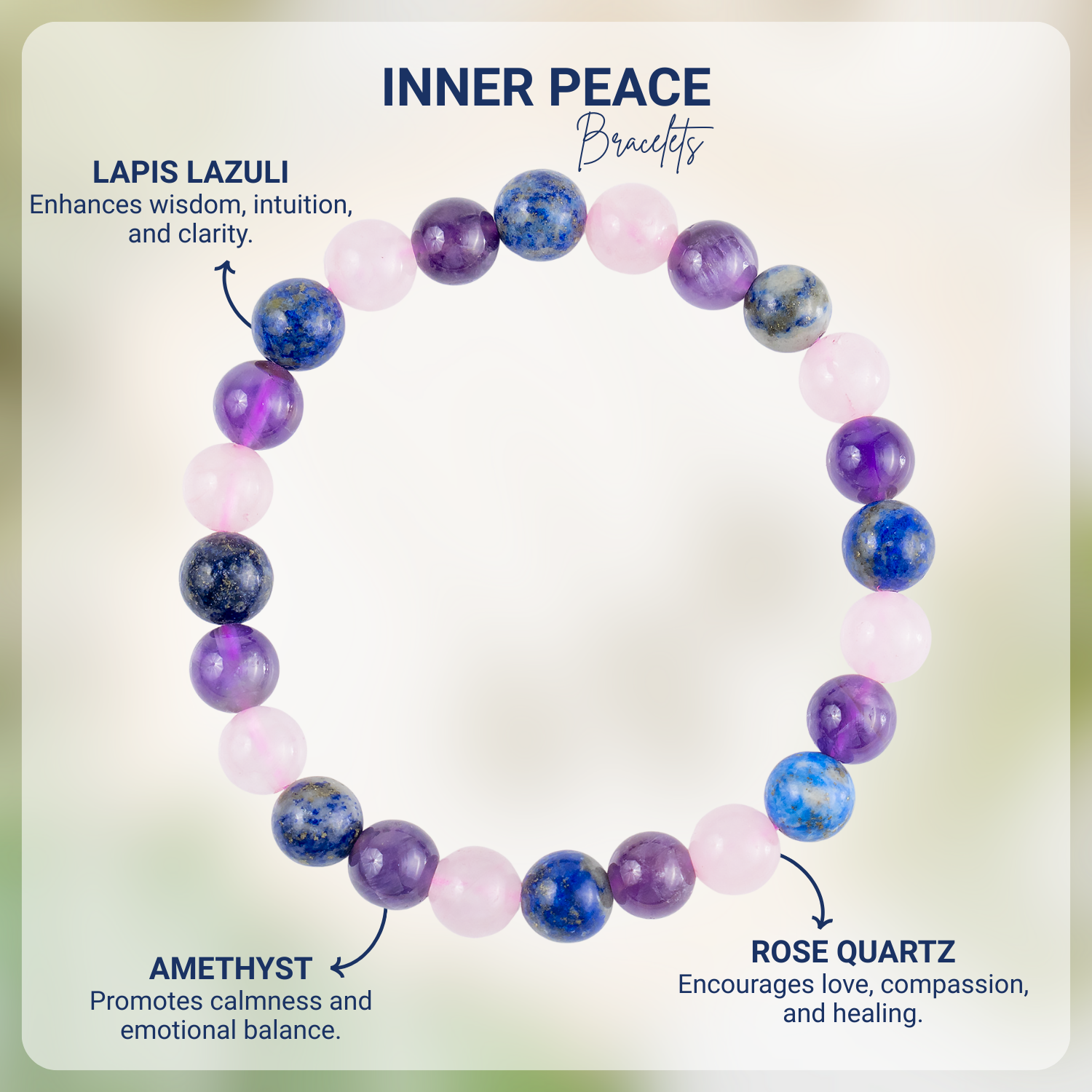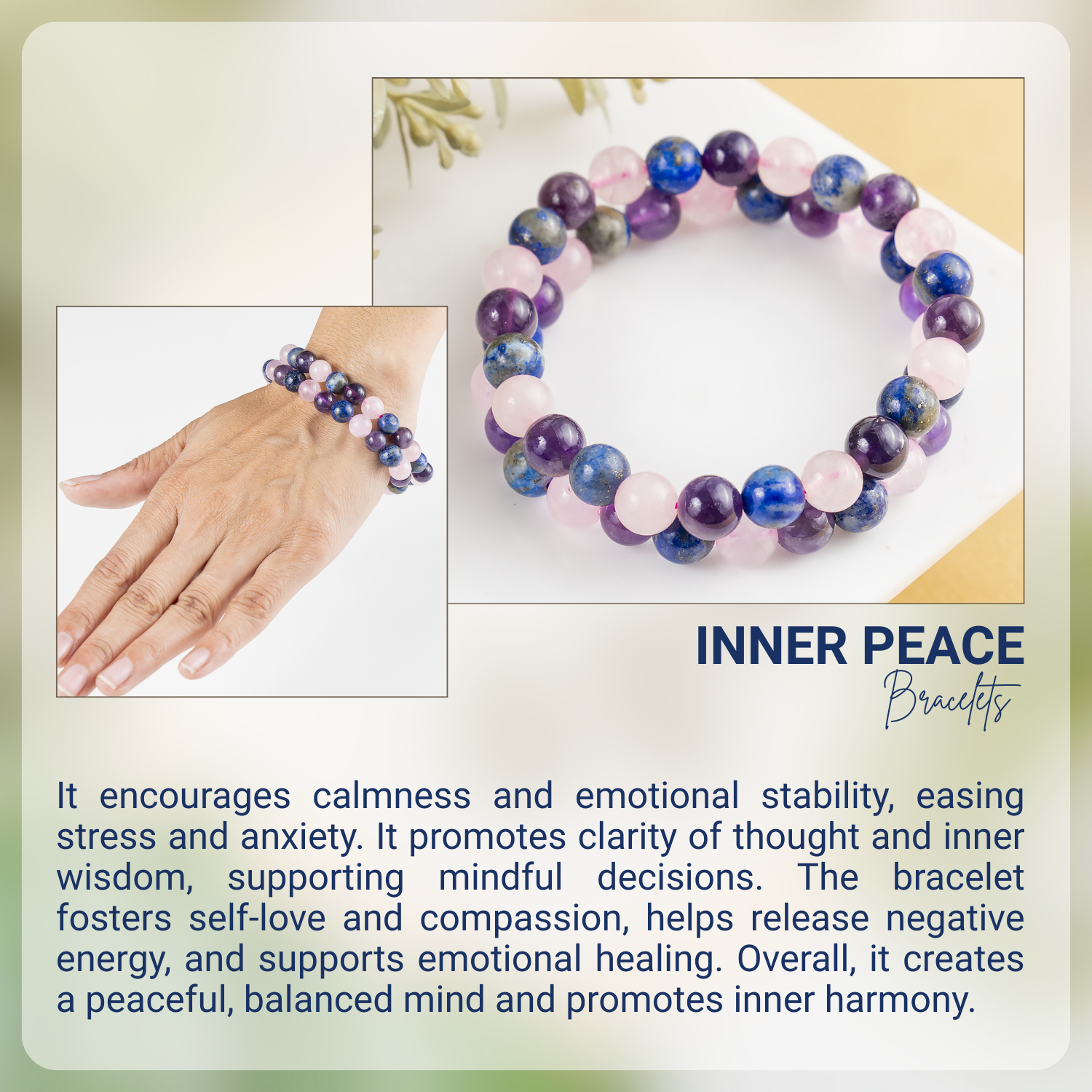 A calming Inner Peace Crystal Bracelet designed to promote tranquility, balance, and emotional harmony. Crafted with soothing healing stones, this bracelet supports meditation, stress relief, and a sense of serenity in daily life.