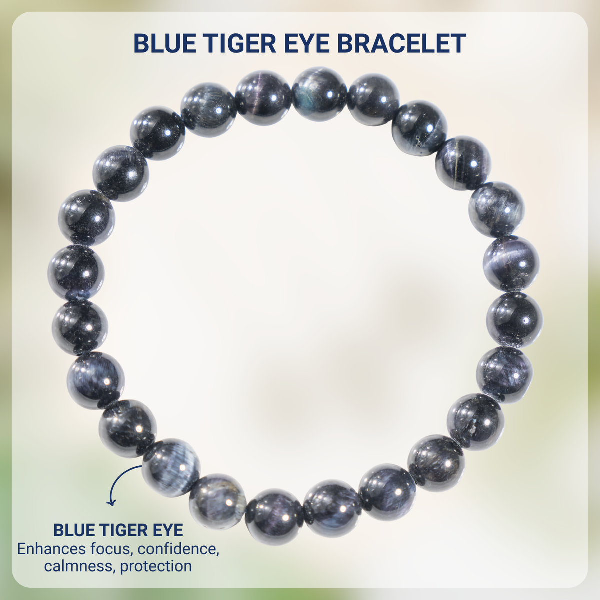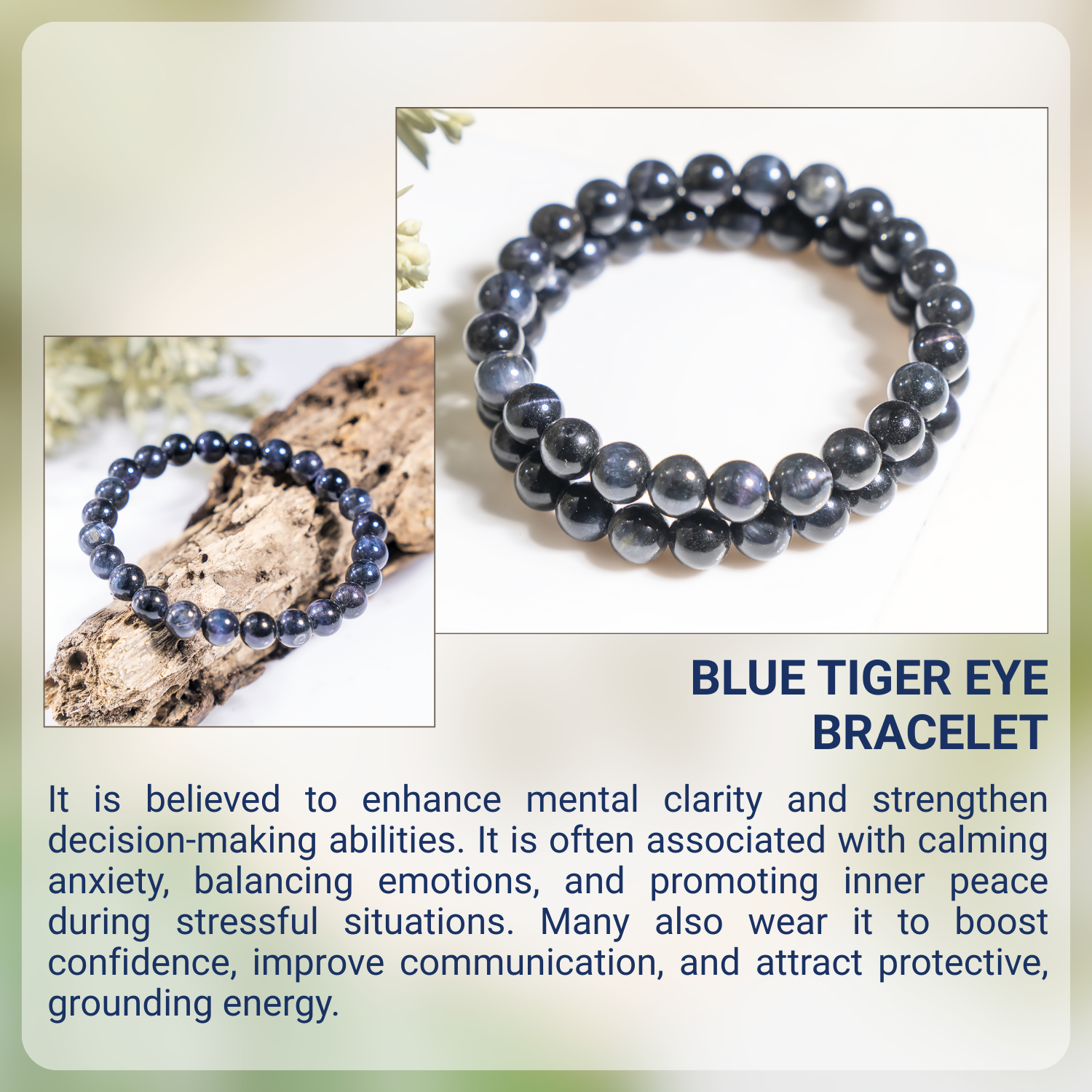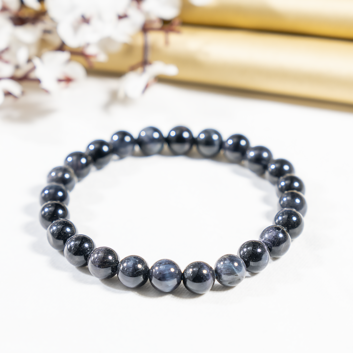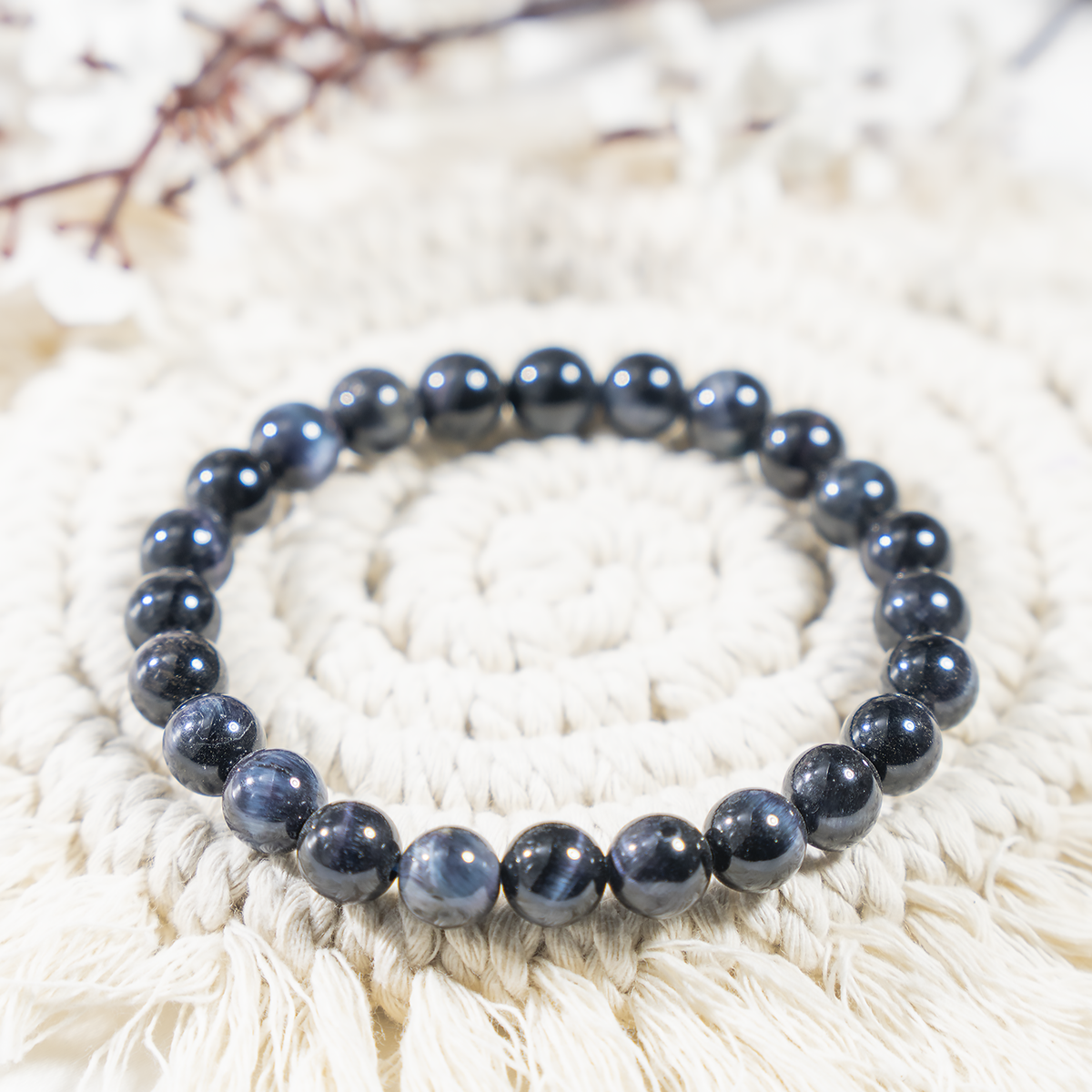 A striking Blue Tiger Eye Crystal Bracelet made from polished natural stones. Its deep blue and shimmering streaks create a stylish and powerful accessory.