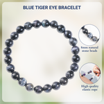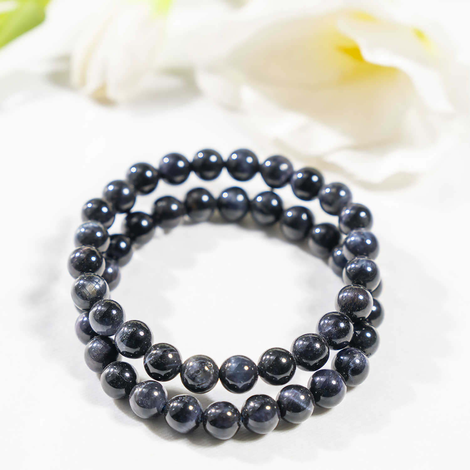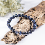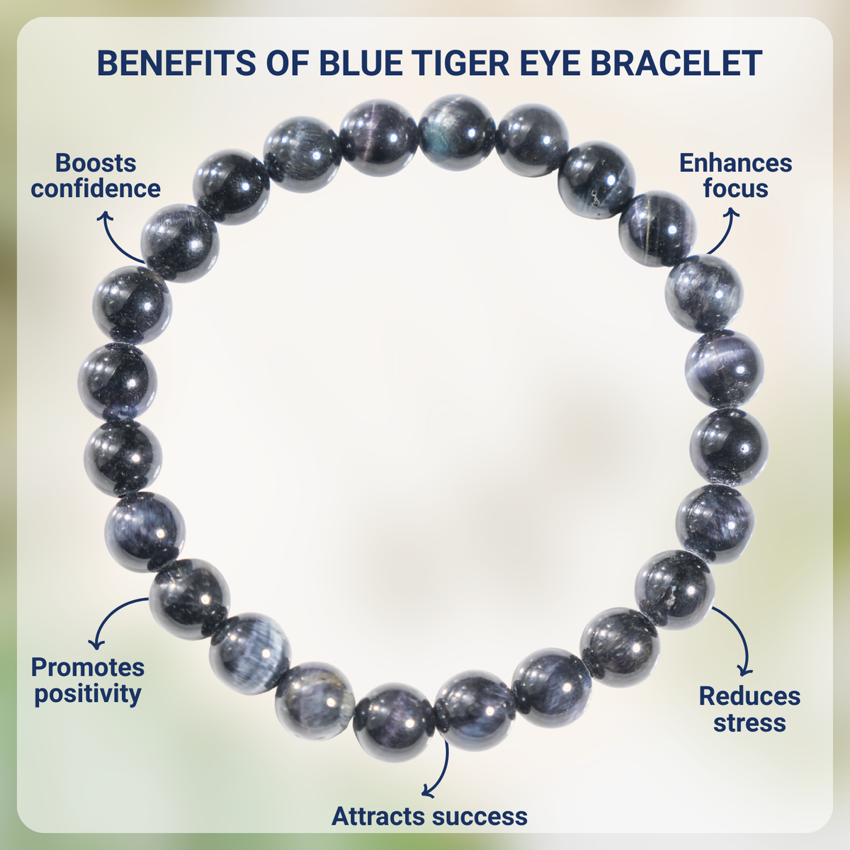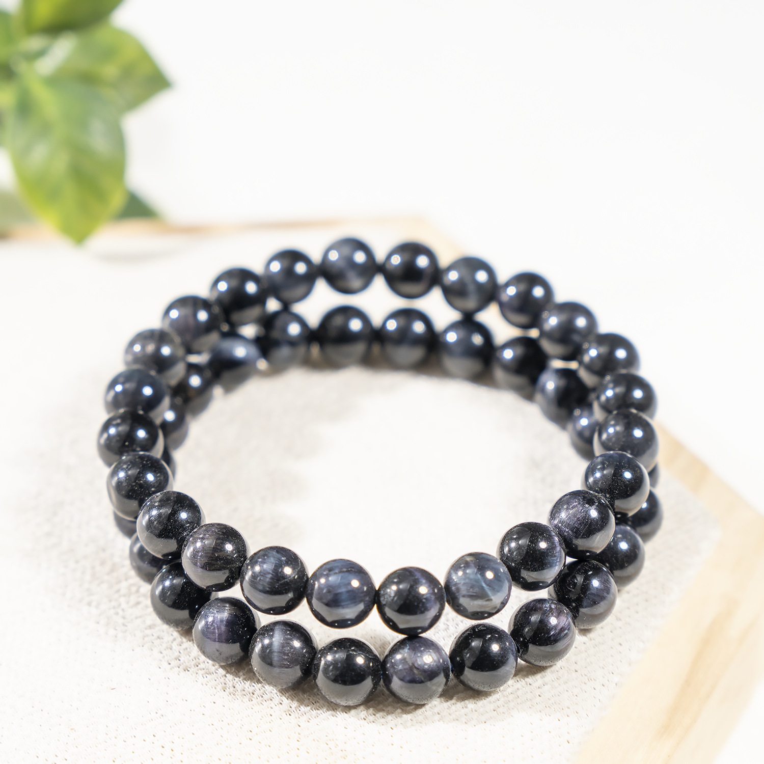 A striking Blue Tiger Eye Crystal Bracelet made from polished natural stones. Its deep blue and shimmering streaks create a stylish and powerful accessory.