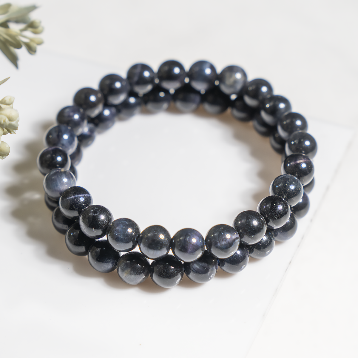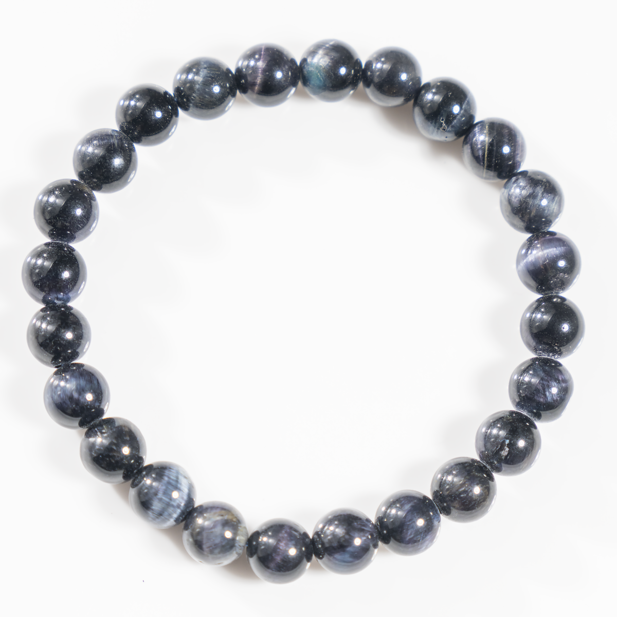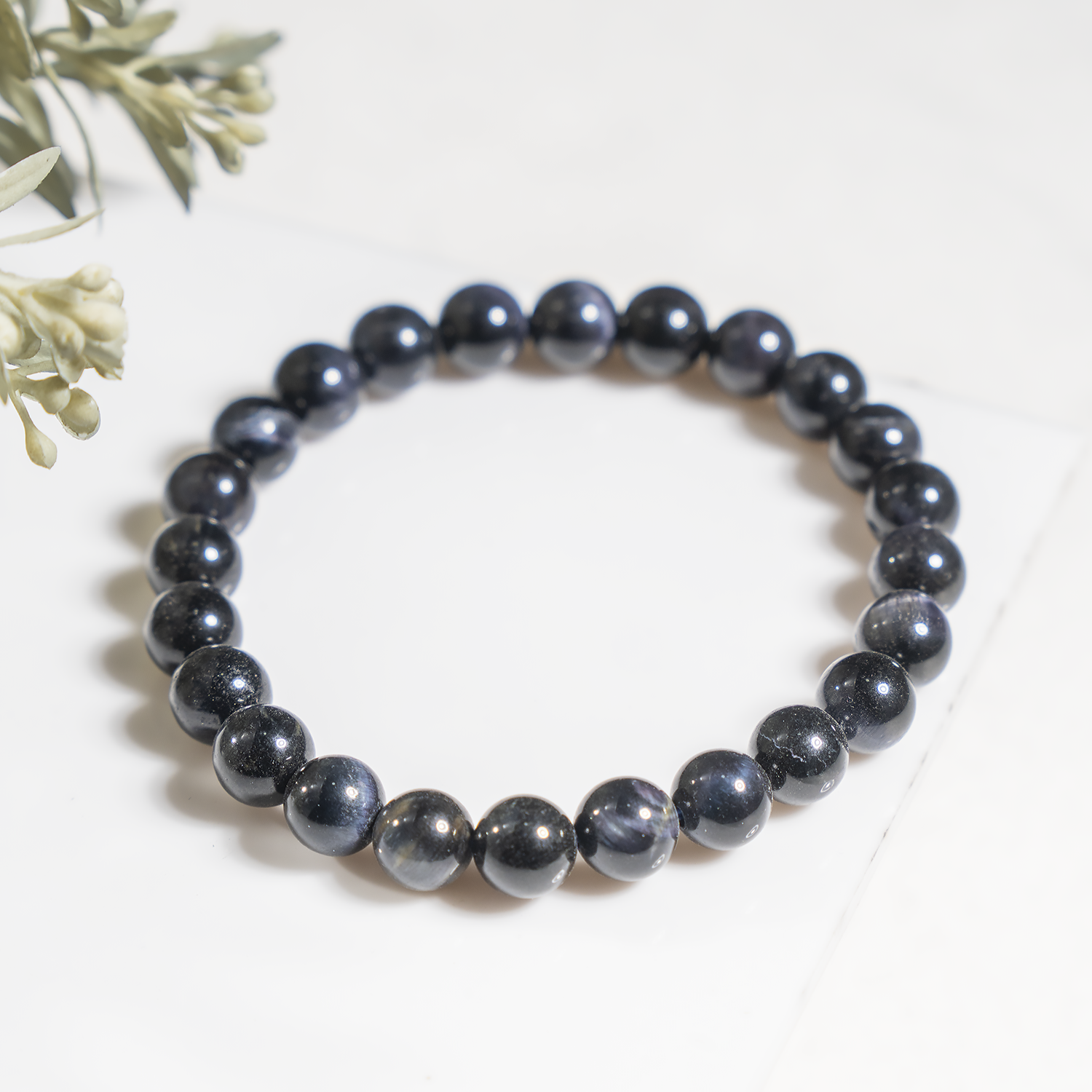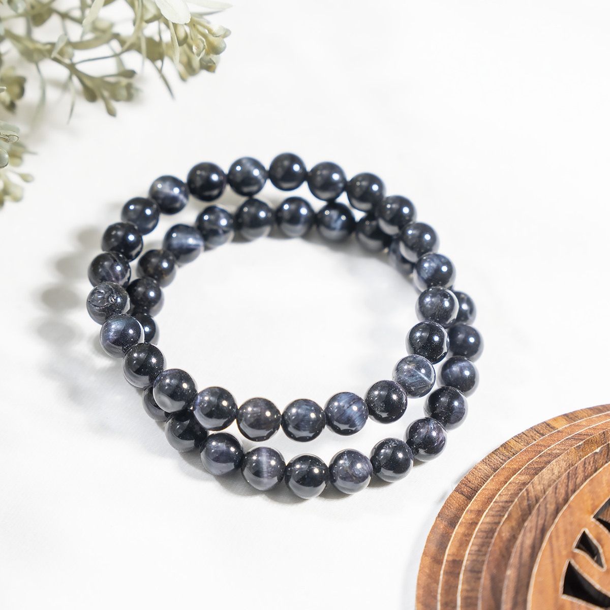 A striking Blue Tiger Eye Crystal Bracelet made from polished natural stones. Its deep blue and shimmering streaks create a stylish and powerful accessory.