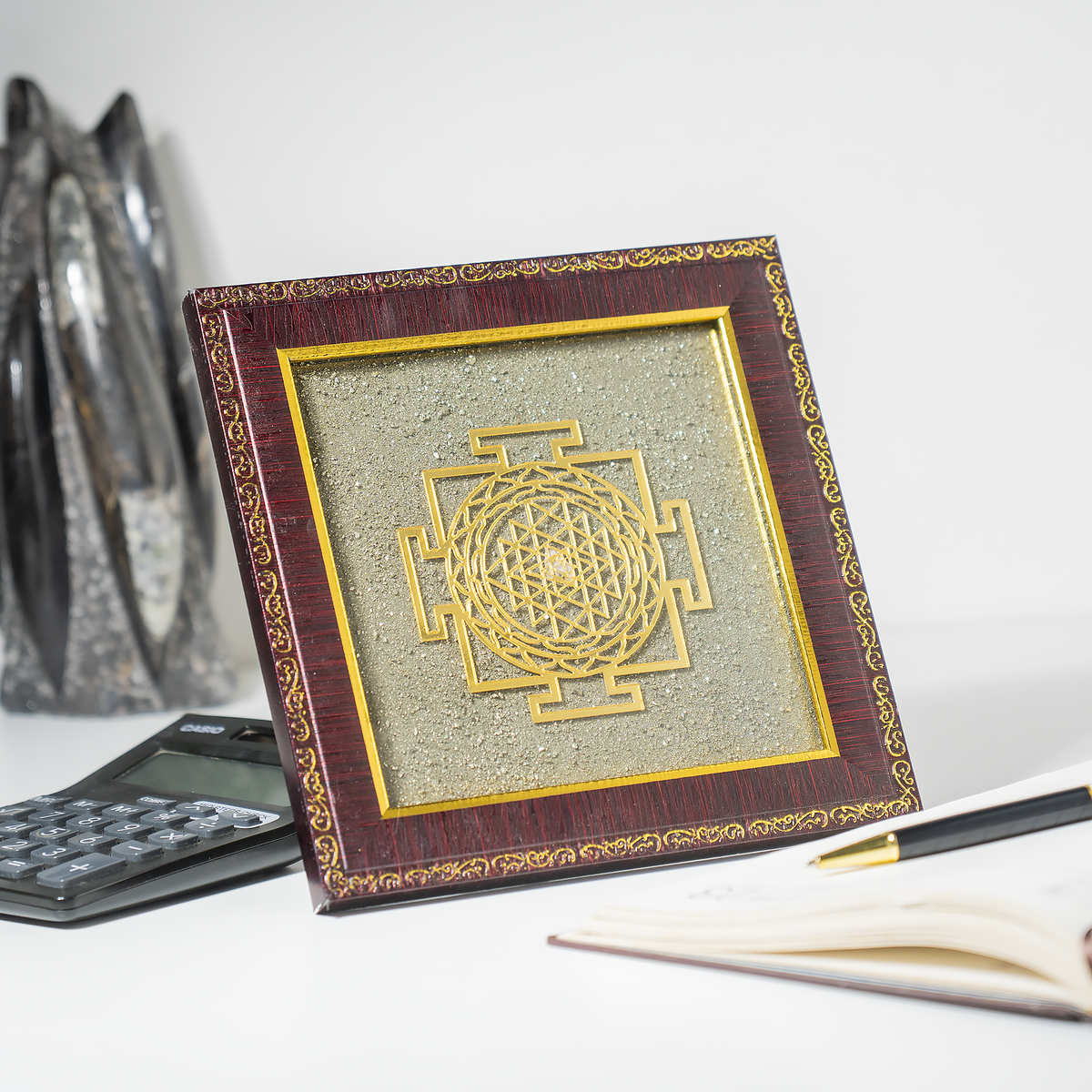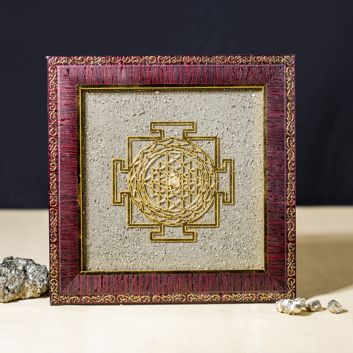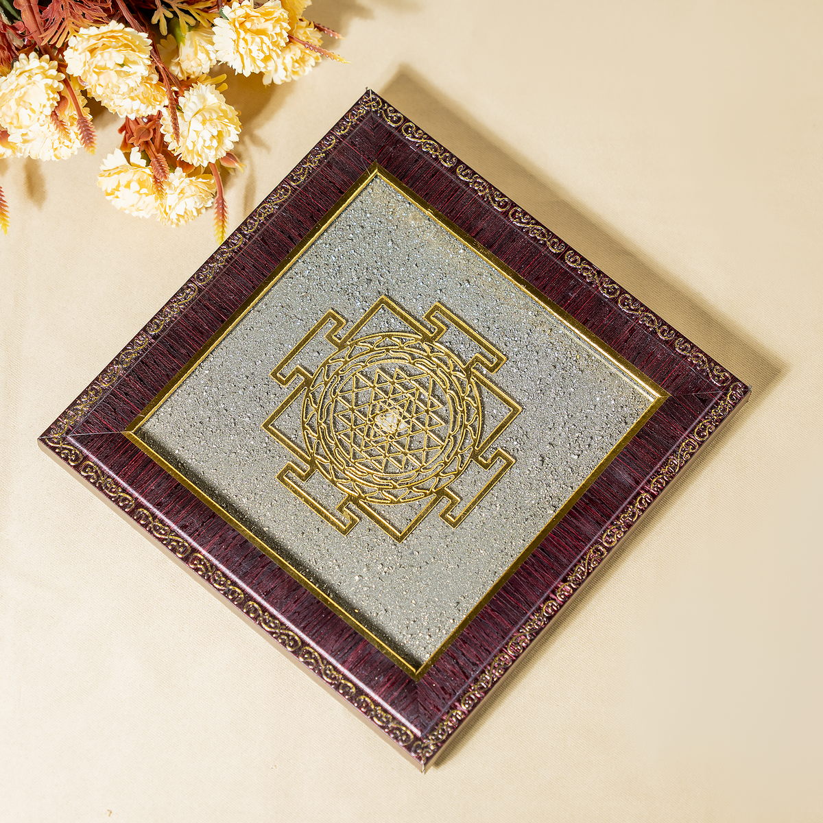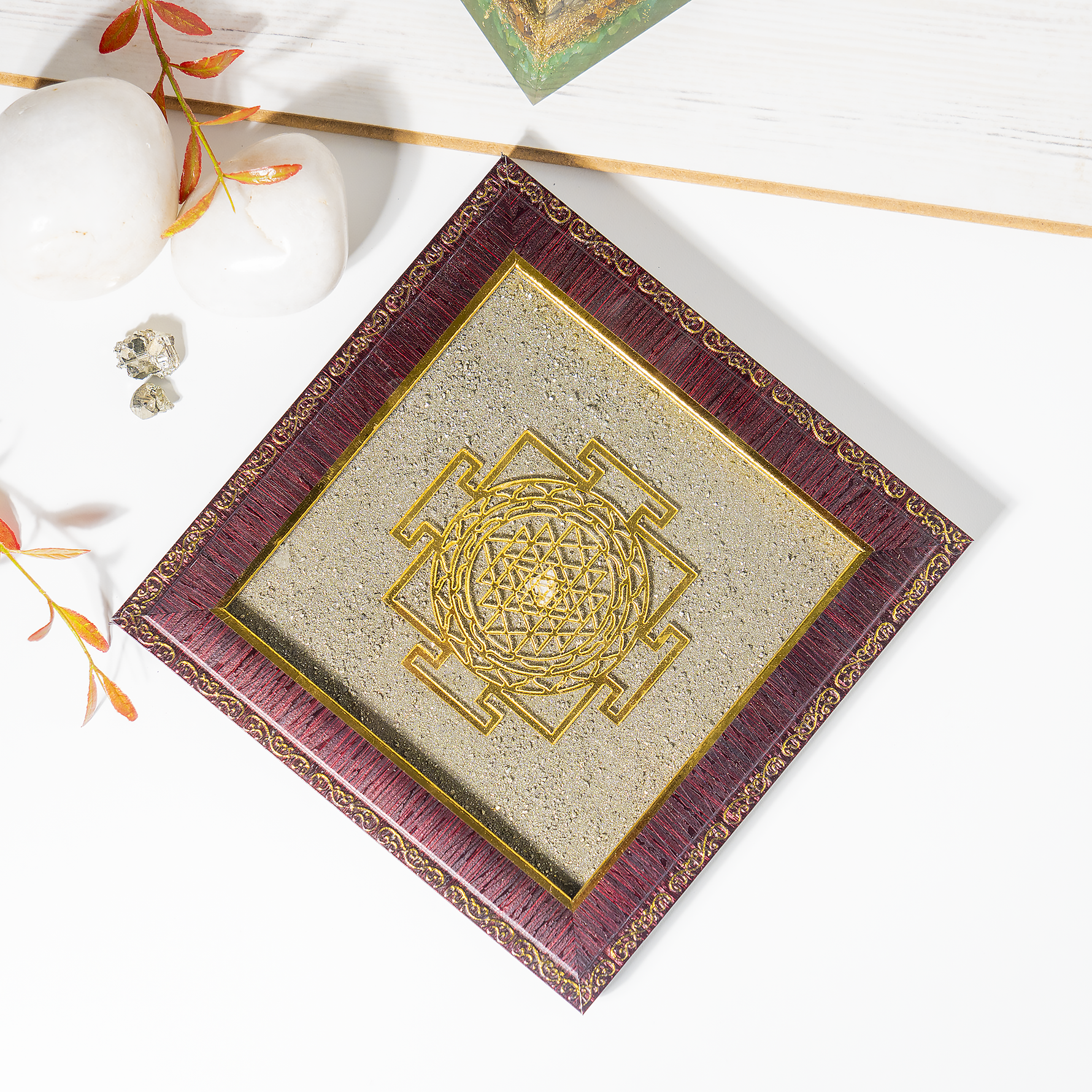 A beautifully crafted Pyrite Dust Plate featuring the sacred Shree Yantra design, perfect for bringing prosperity, positivity, and spiritual balance into any space. This shimmering decor piece adds an elegant touch to your home while enhancing energy flow and promoting abundance. Ideal for meditation rooms, altars, offices, or living spaces.