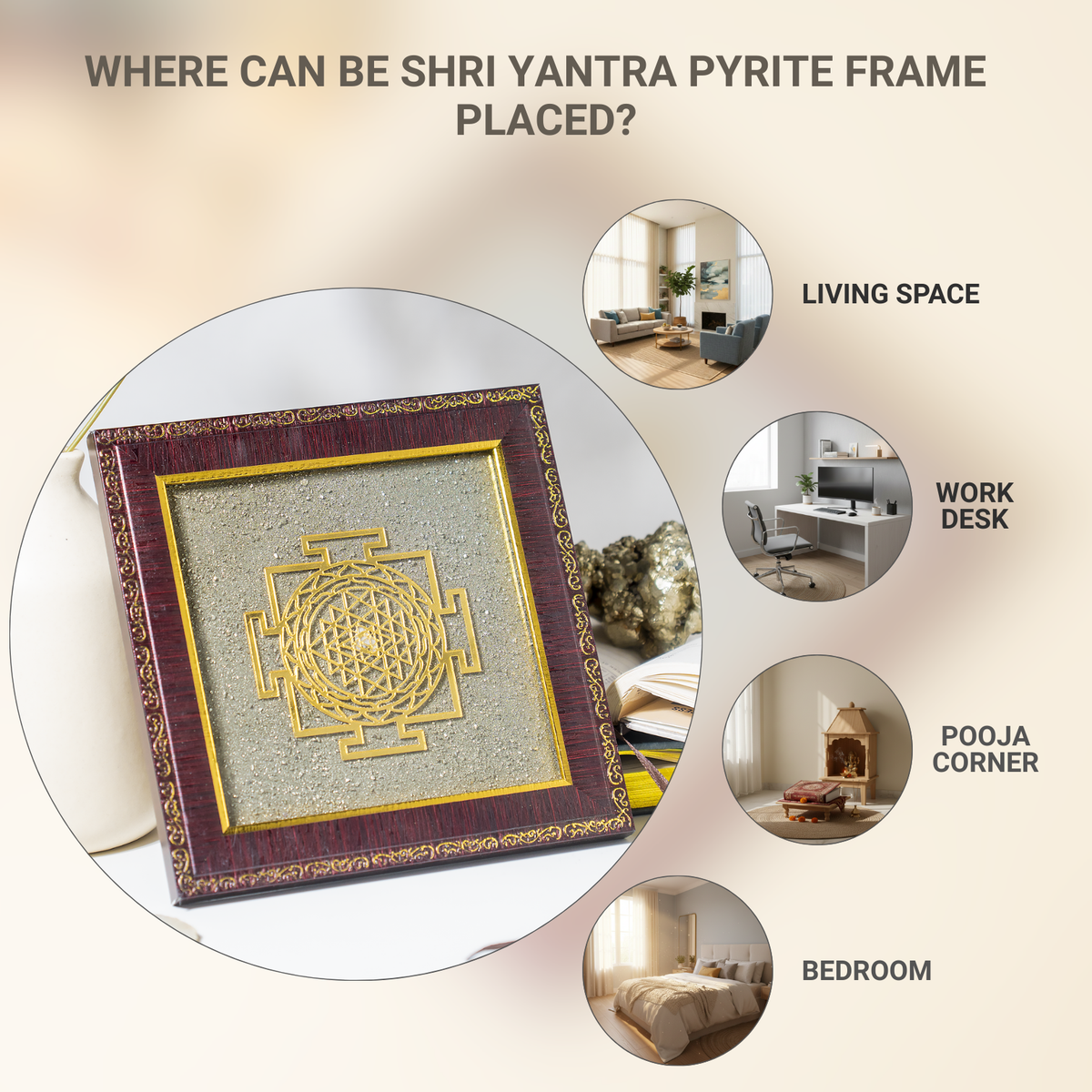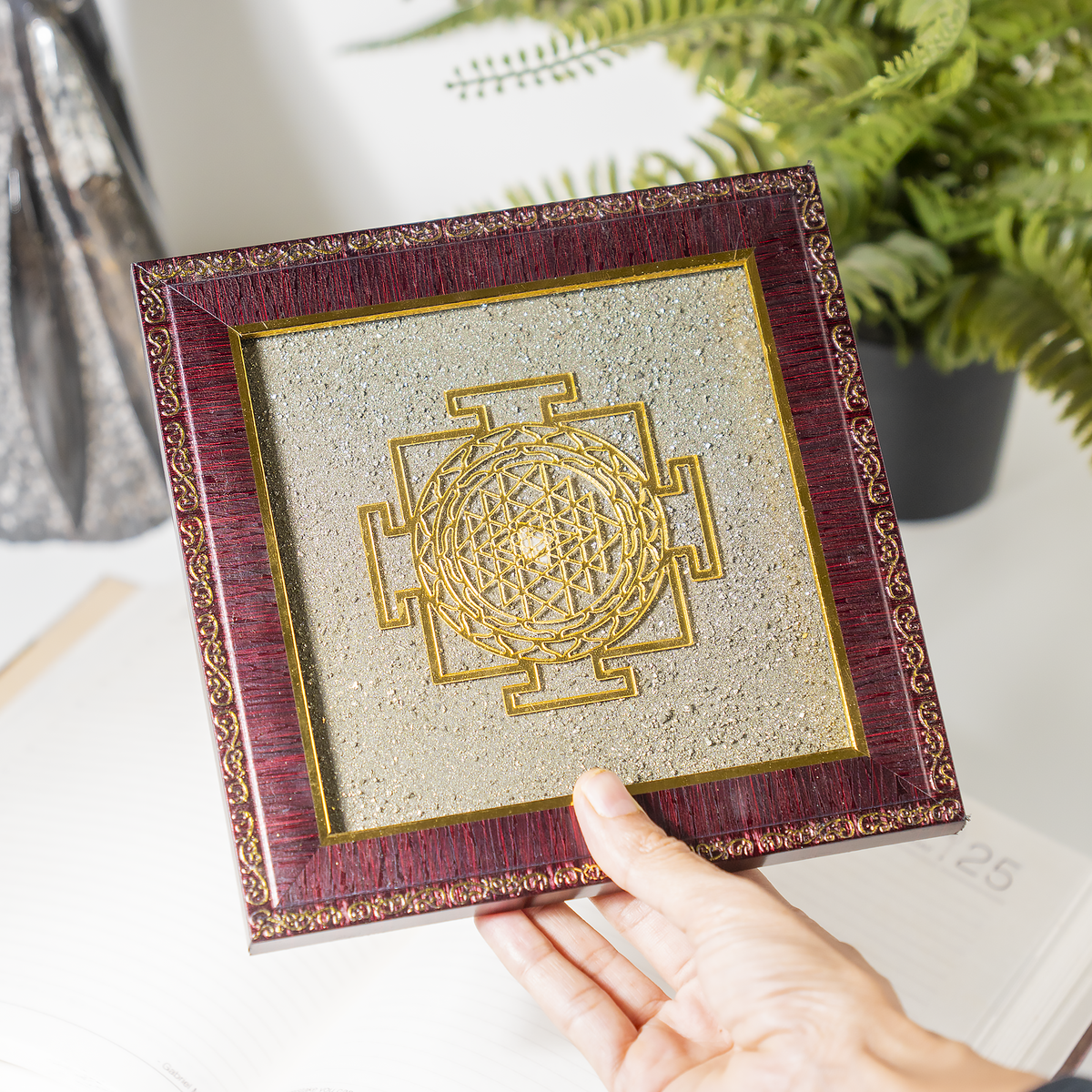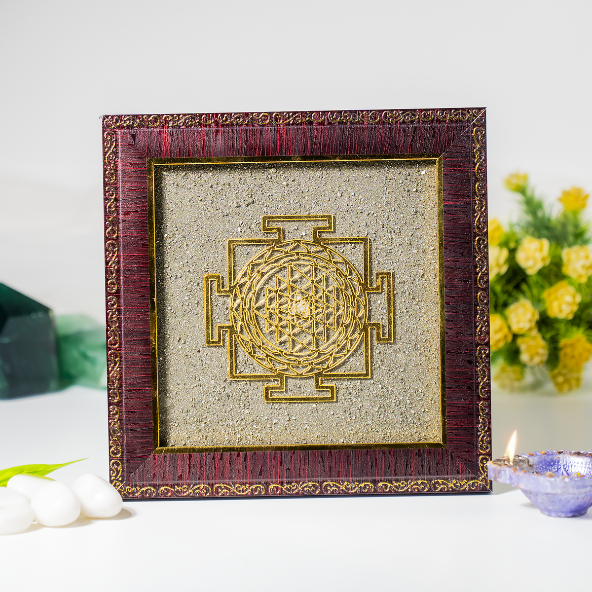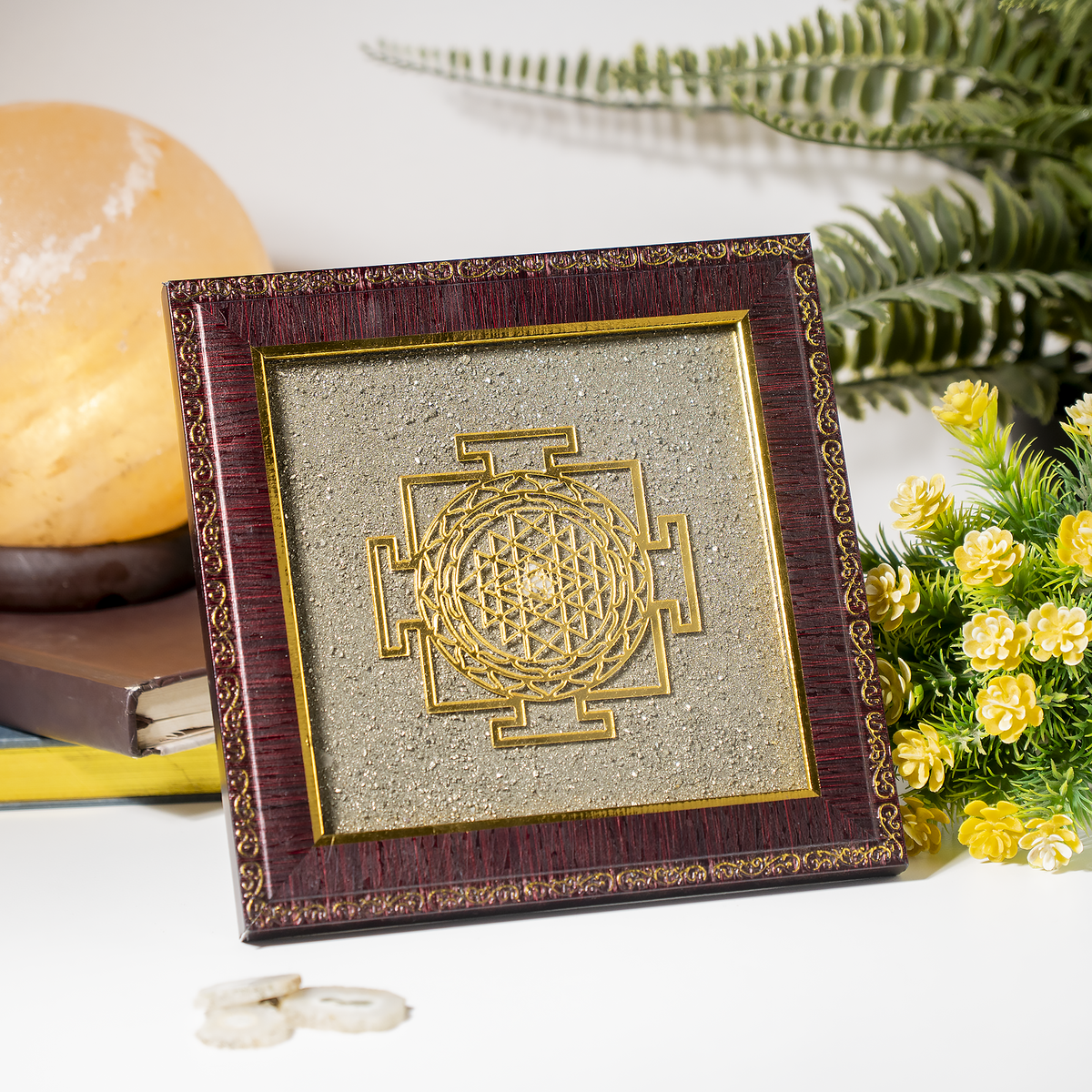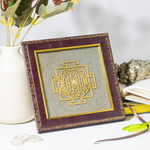A beautifully crafted Pyrite Dust Plate featuring the sacred Shree Yantra design, perfect for bringing prosperity, positivity, and spiritual balance into any space. This shimmering decor piece adds an elegant touch to your home while enhancing energy flow and promoting abundance. Ideal for meditation rooms, altars, offices, or living spaces.