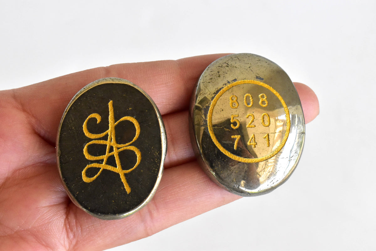 Pyrite Zibu symbols are powerful talismans of protection, abundance, and positivity. Carved with sacred Zibu symbols, they amplify intention, boost confidence, and attract prosperity.