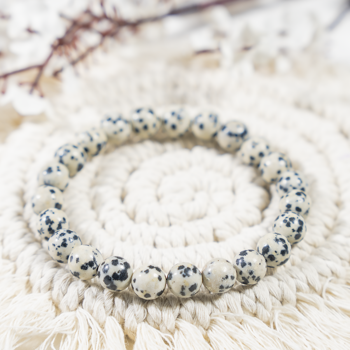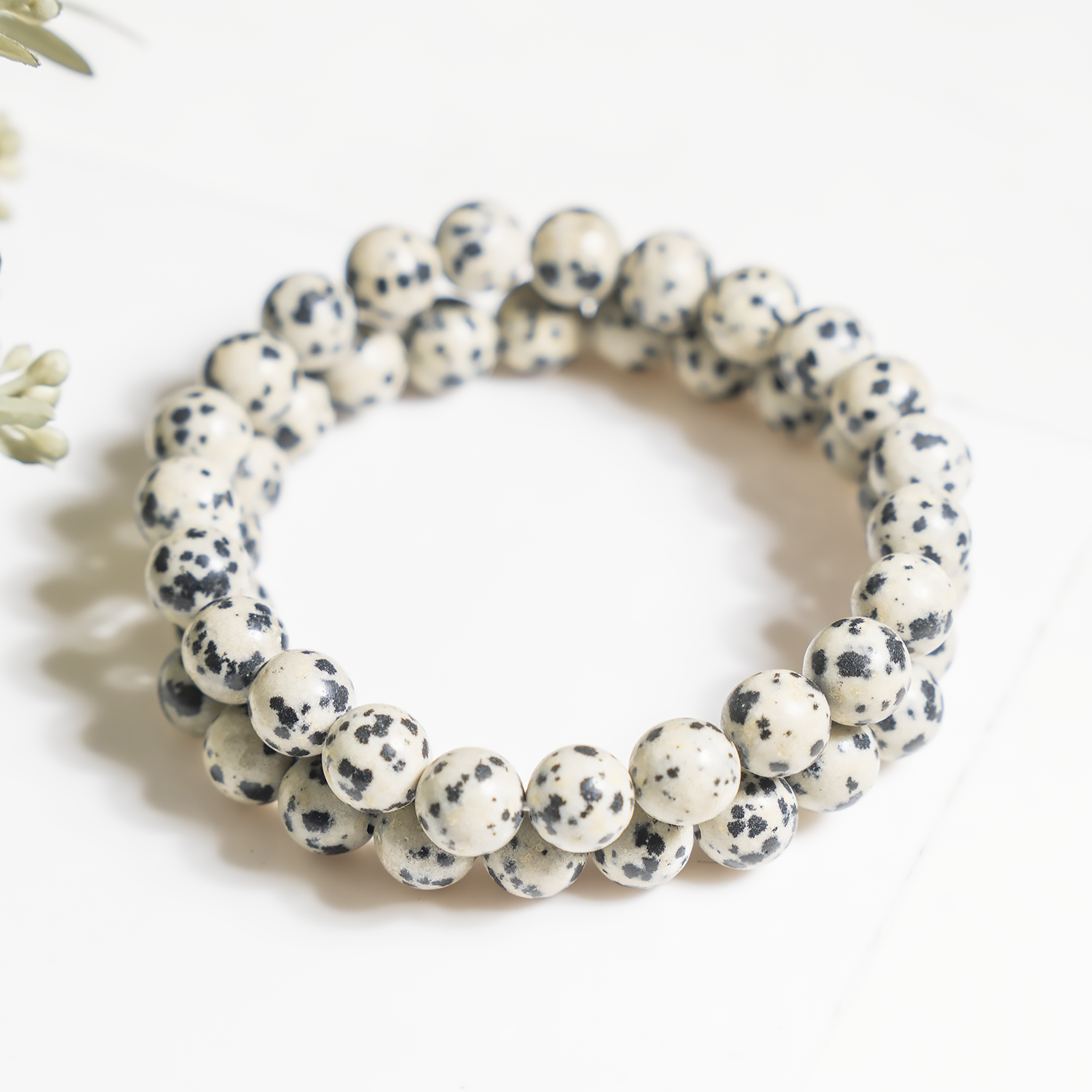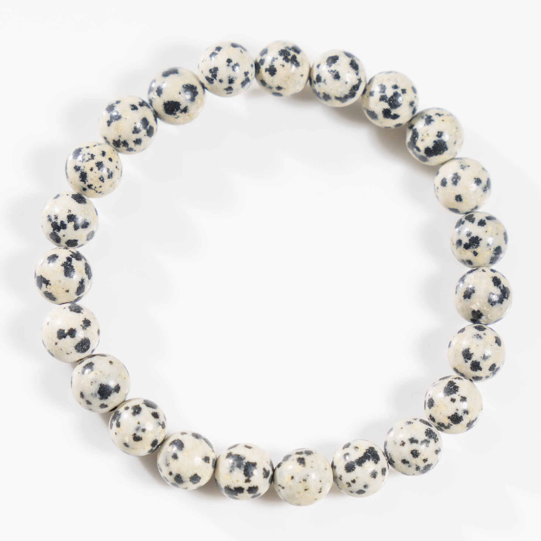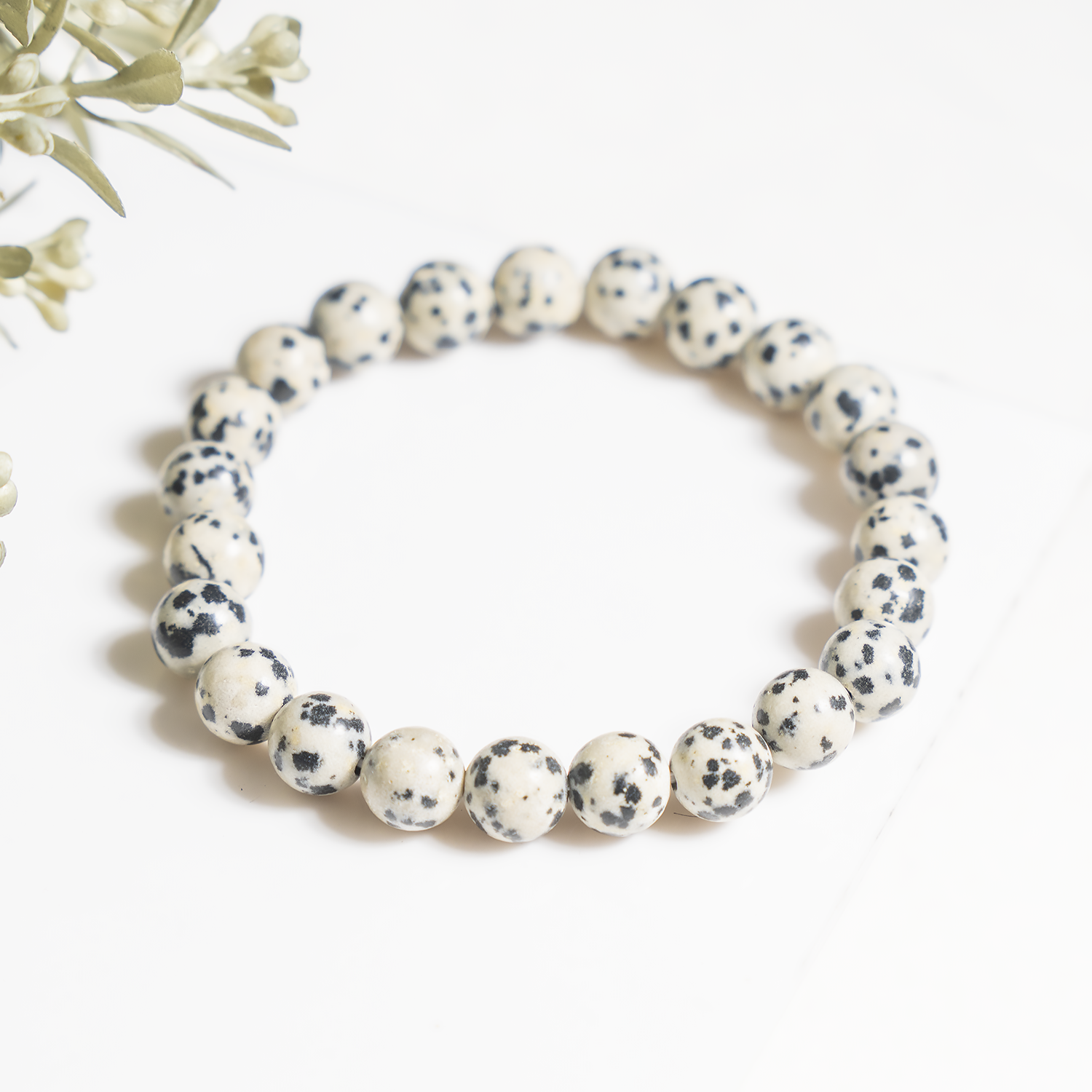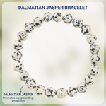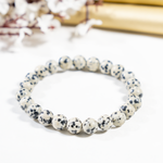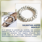 A playful Dalmatian Jasper bracelet featuring cream-colored stones with natural black spots, known for its joyful and grounding energy.