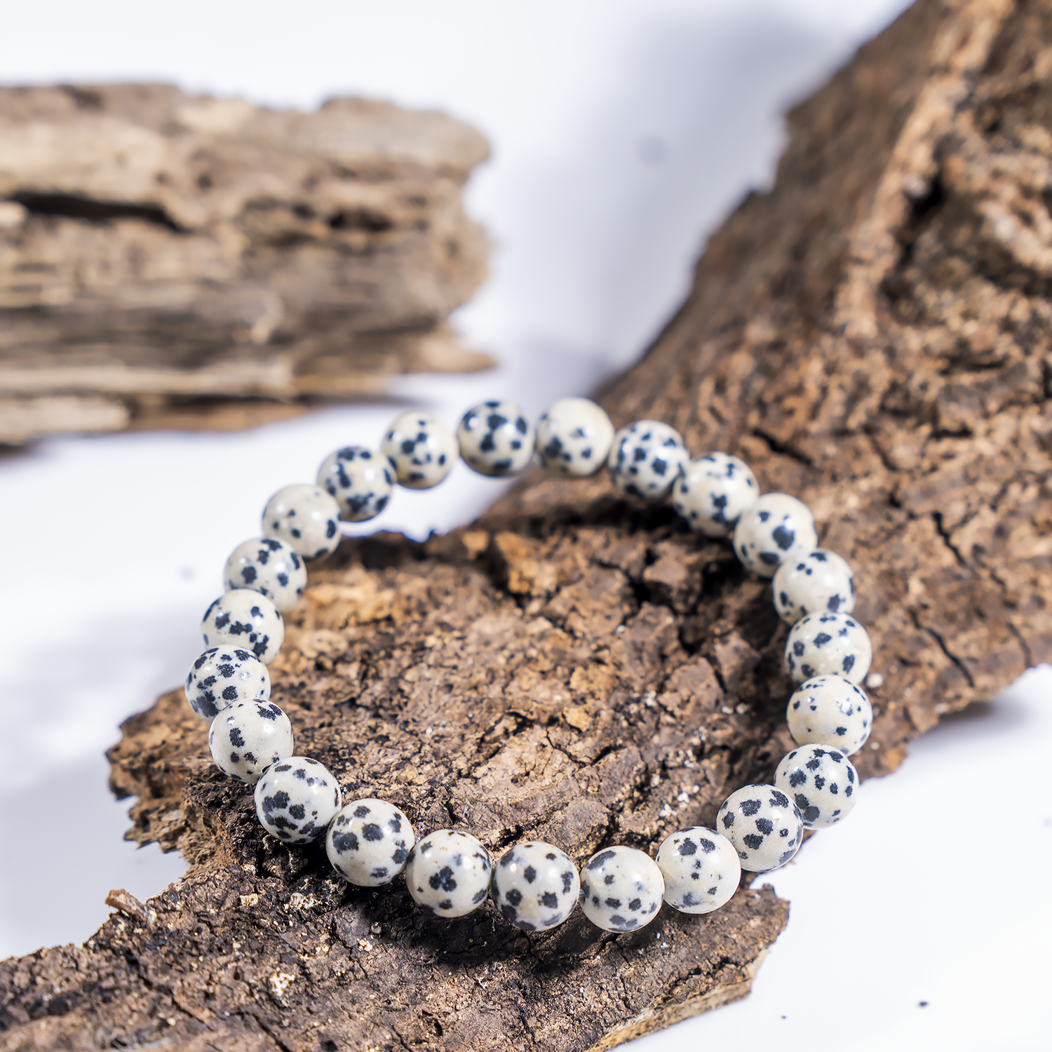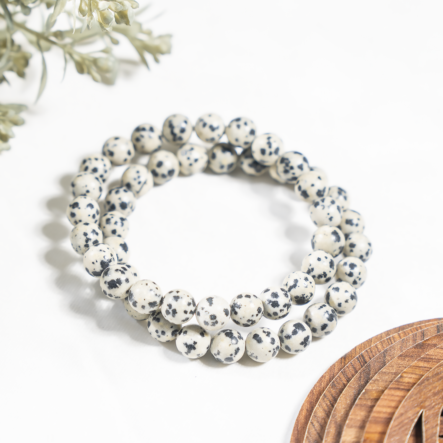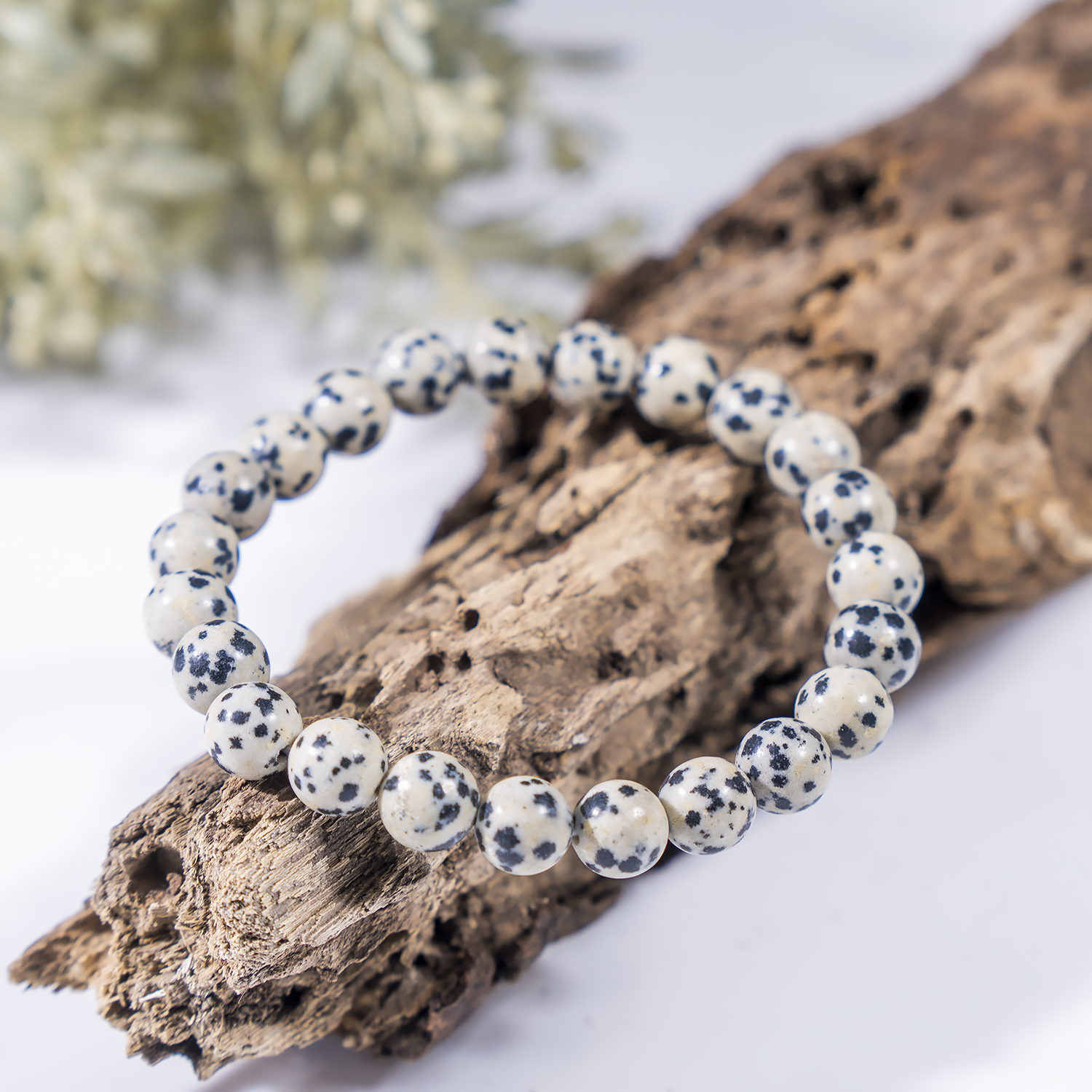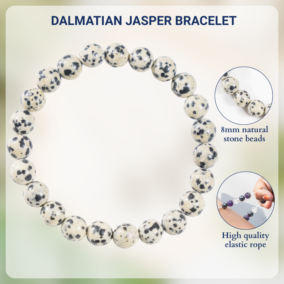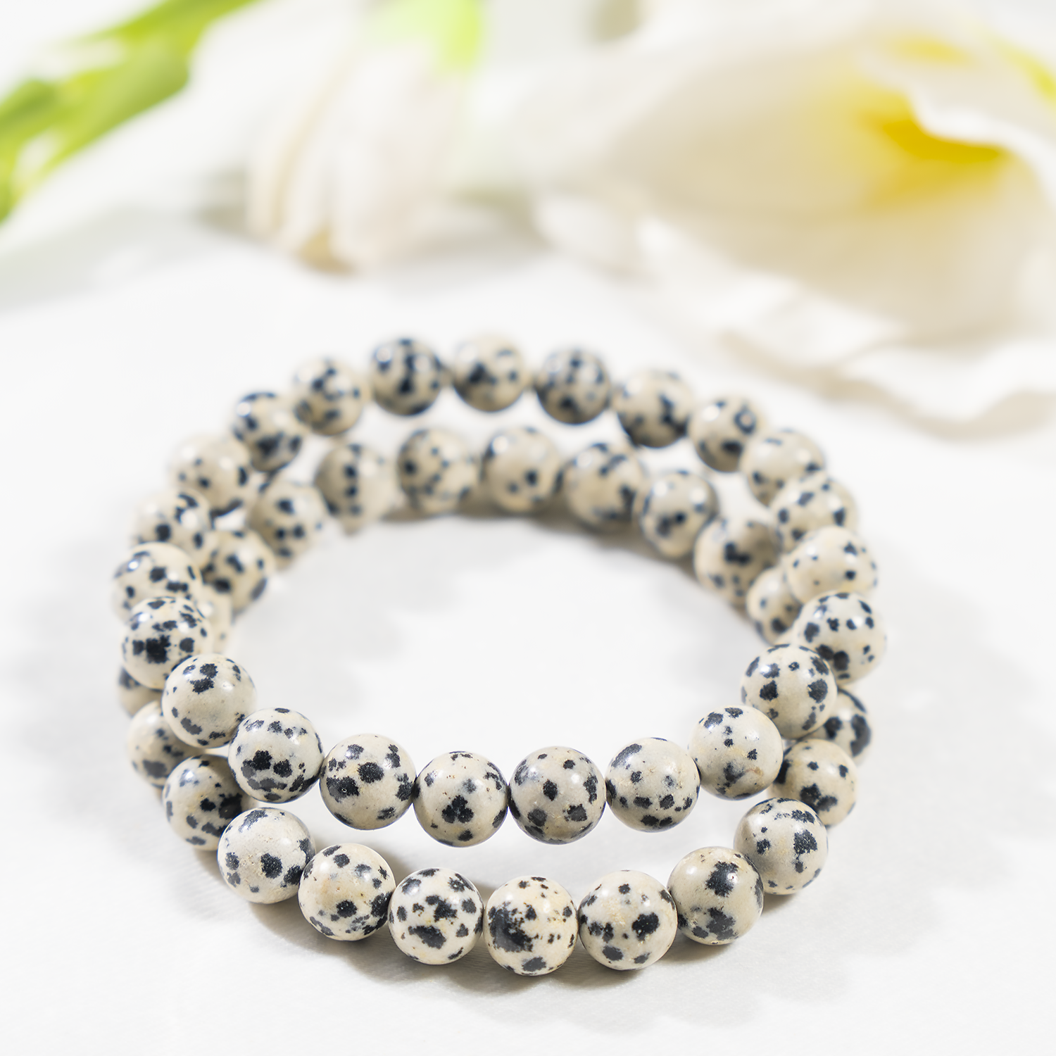 A playful Dalmatian Jasper bracelet featuring cream-colored stones with natural black spots, known for its joyful and grounding energy.