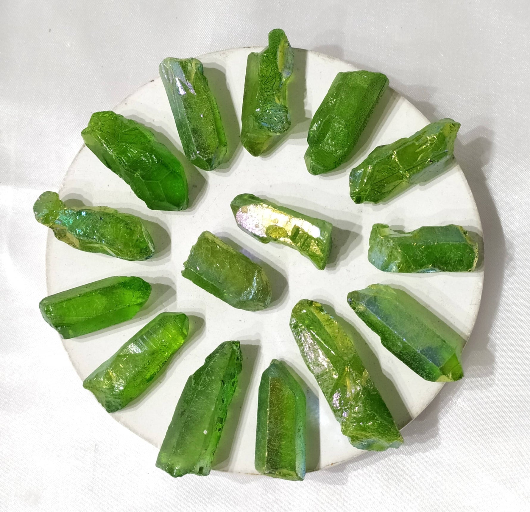 Natural quartz infused with metals to create a beautiful green iridescent shine. Perfect for meditation, healing practices, and crystal collections. ✨