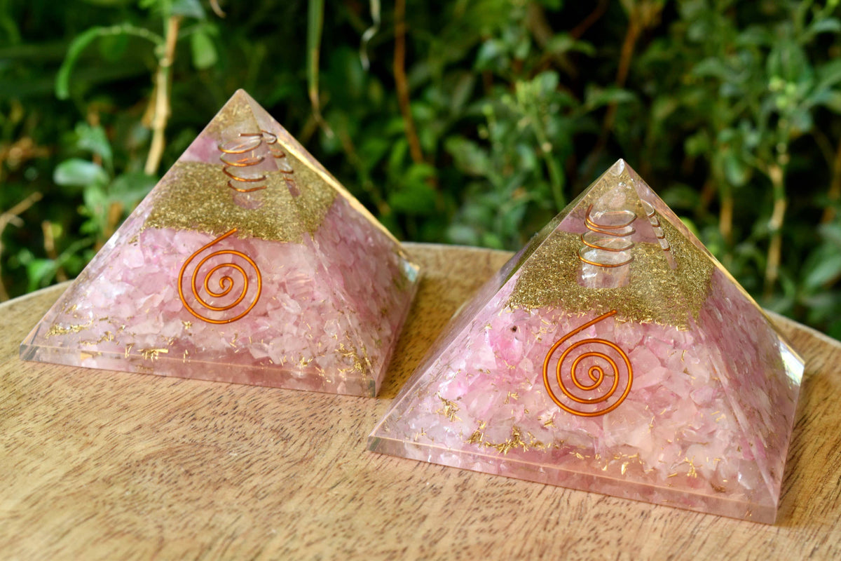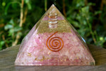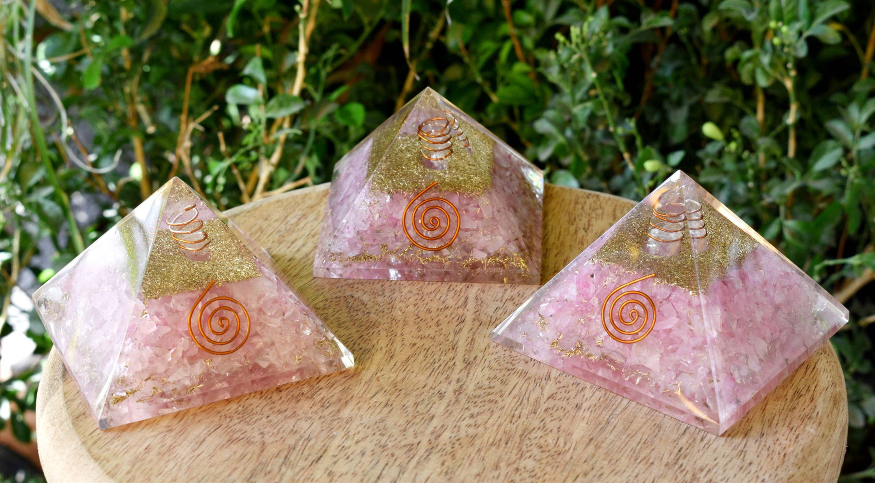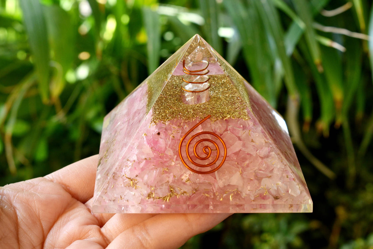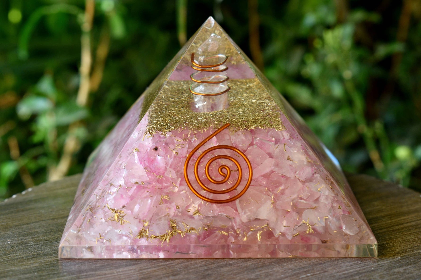 The Rose Quartz Orgone Pyramid is a unique, two to three inch, pyramid-shaped orgonite specifically crafted to help bring balance and harmony to any space. Crafted with a rose quartz base and layers of non toxic resin embedded with metallic shavings and gemstones, this 2-3 inch pyramid is perfect for any space. When placed in a room or office 👌💖