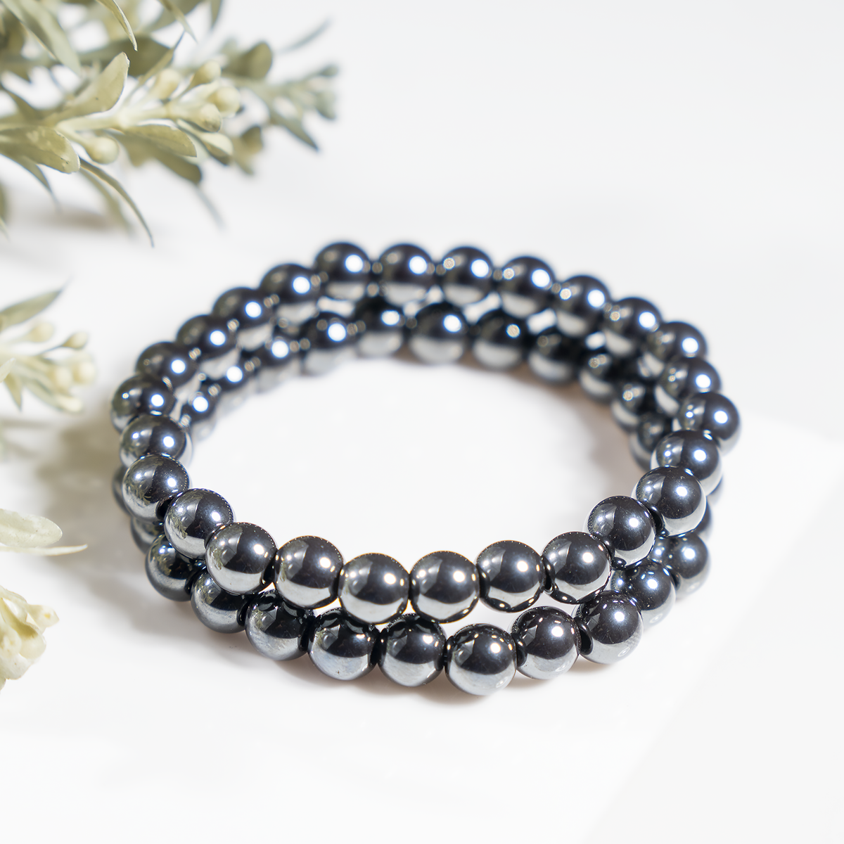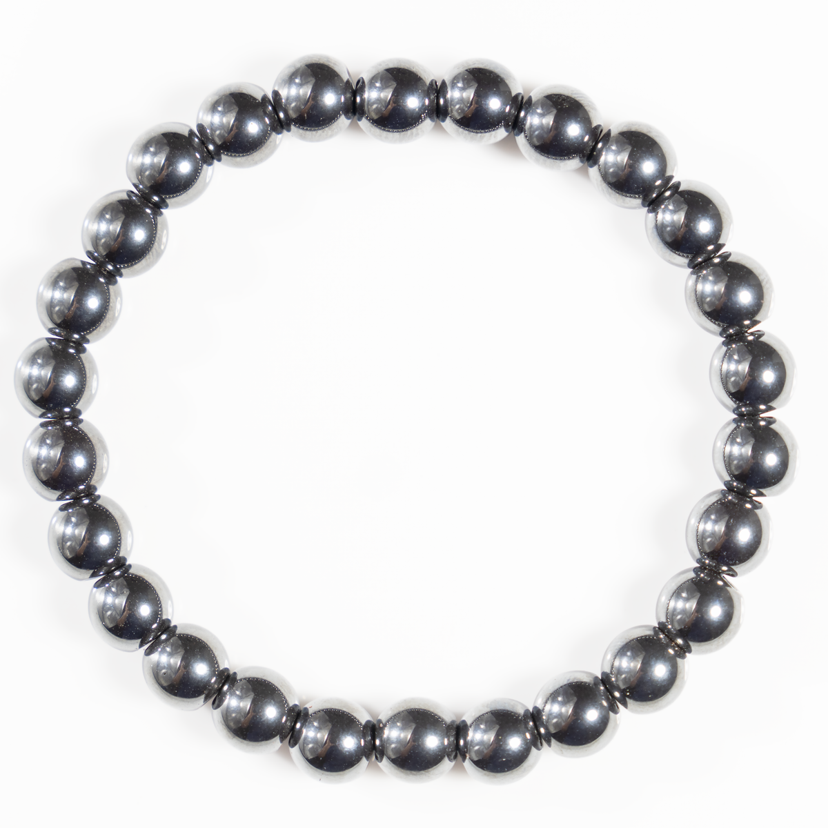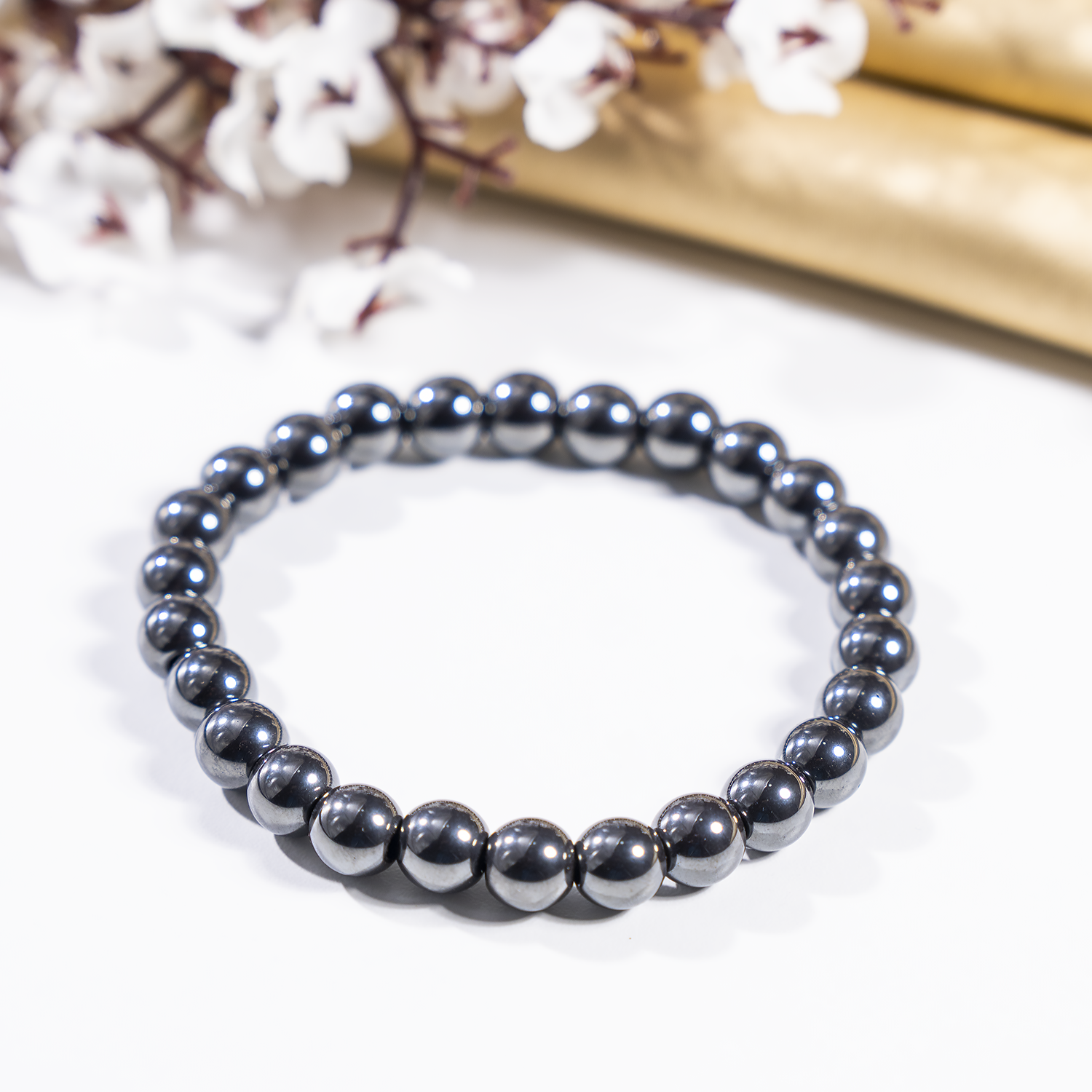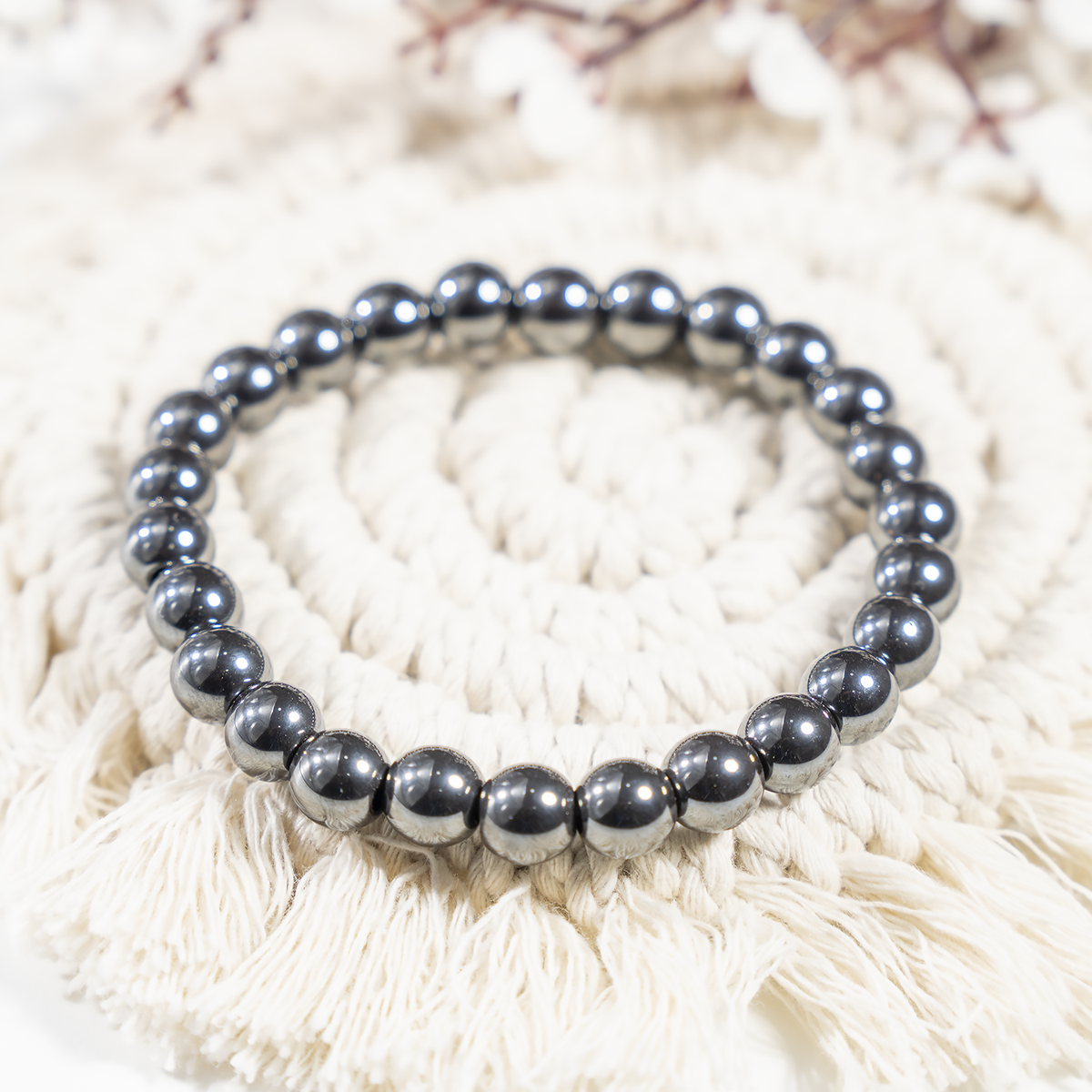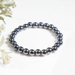 A sleek bracelet crafted with polished Hematite beads, valued for its grounding and protective qualities.
