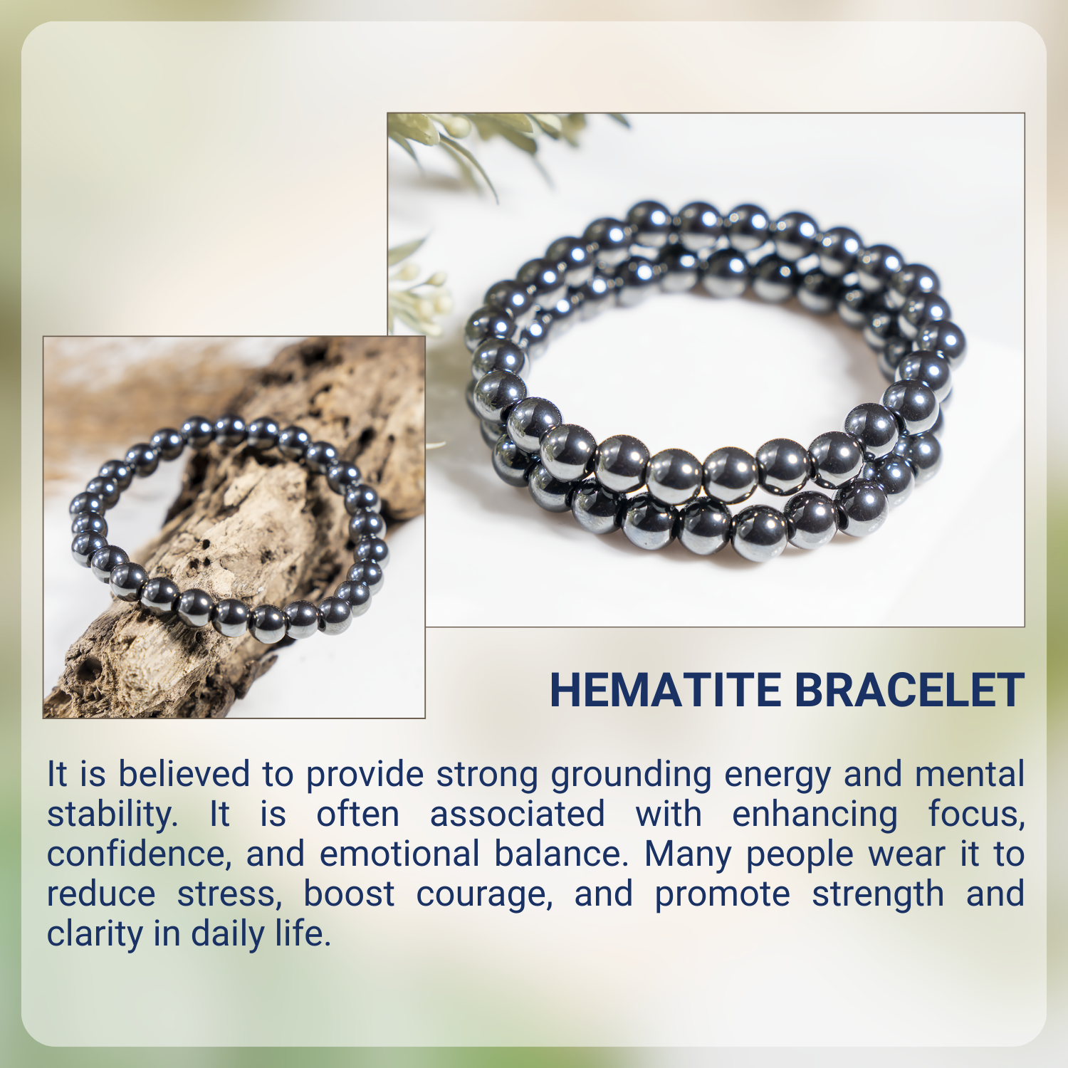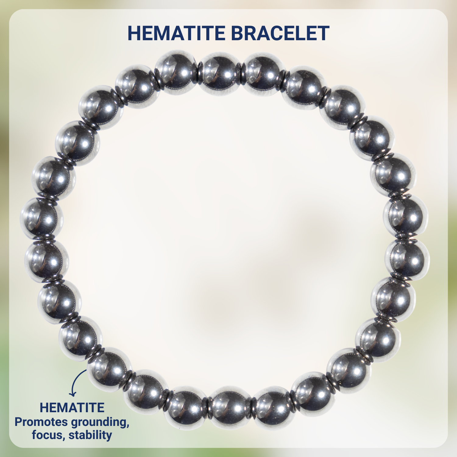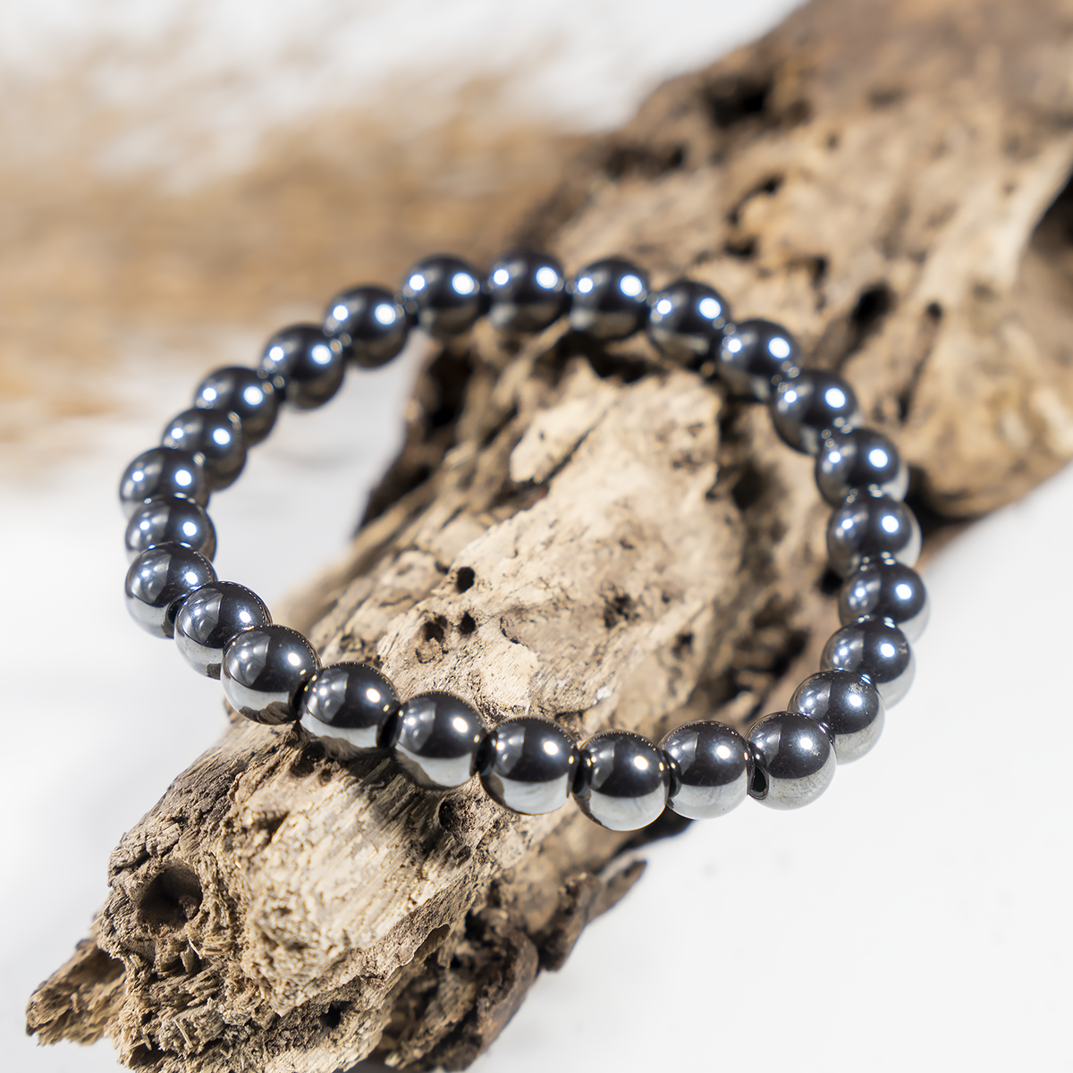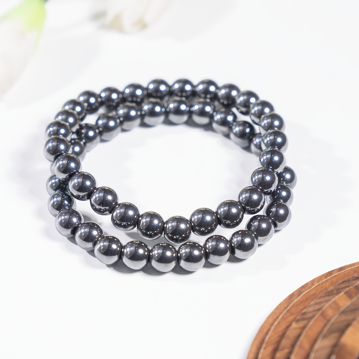 A sleek bracelet crafted with polished Hematite beads, valued for its grounding and protective qualities.