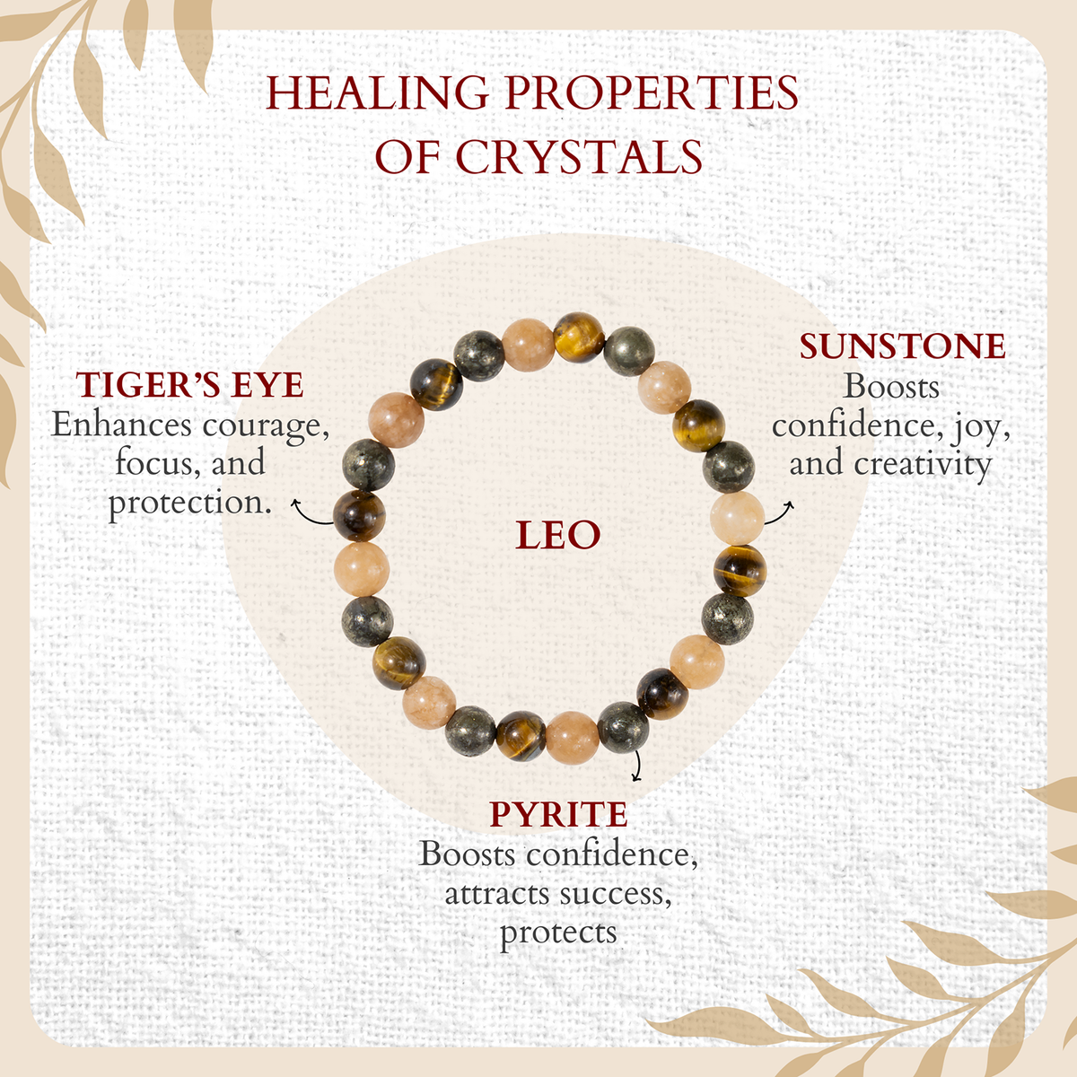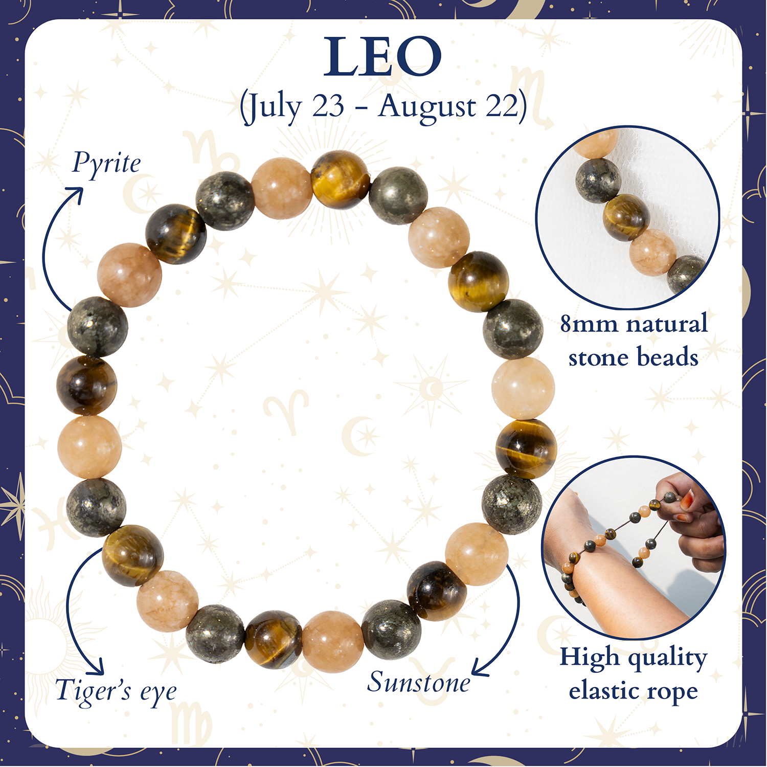 Each bracelet is handmade with carefully selected healing crystals for Leo, featuring powerful gemstones that embody the radiant and magnetic character of the Leo zodiac sign.