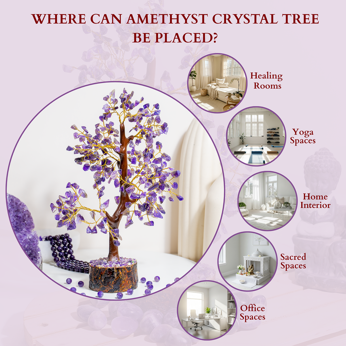• Amethyst is believed to promote peace, relaxation, and inner strength, making it ideal for meditation and healing spaces.
