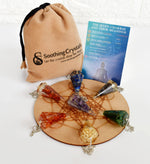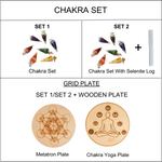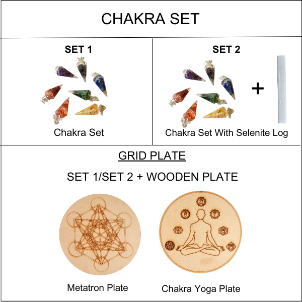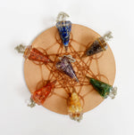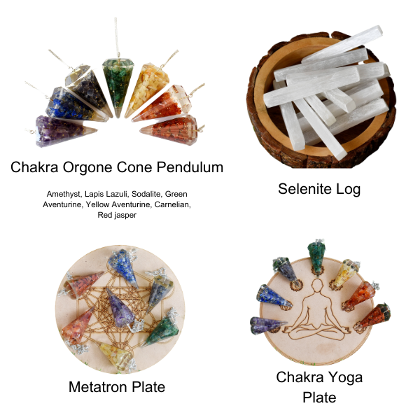 Chakra Crystals Orgone Pendulums Set, with Wooden Grid Plate, Selenite Log