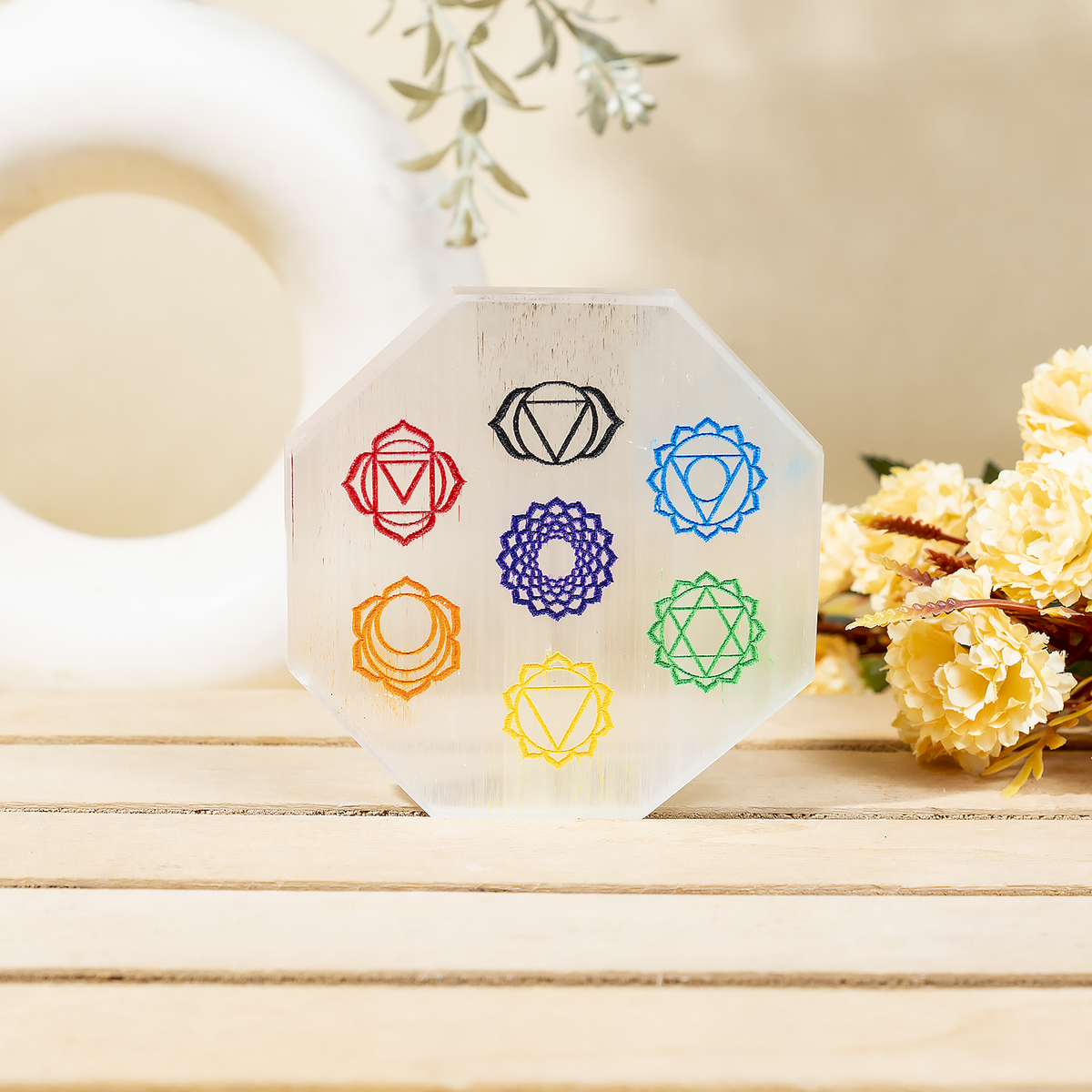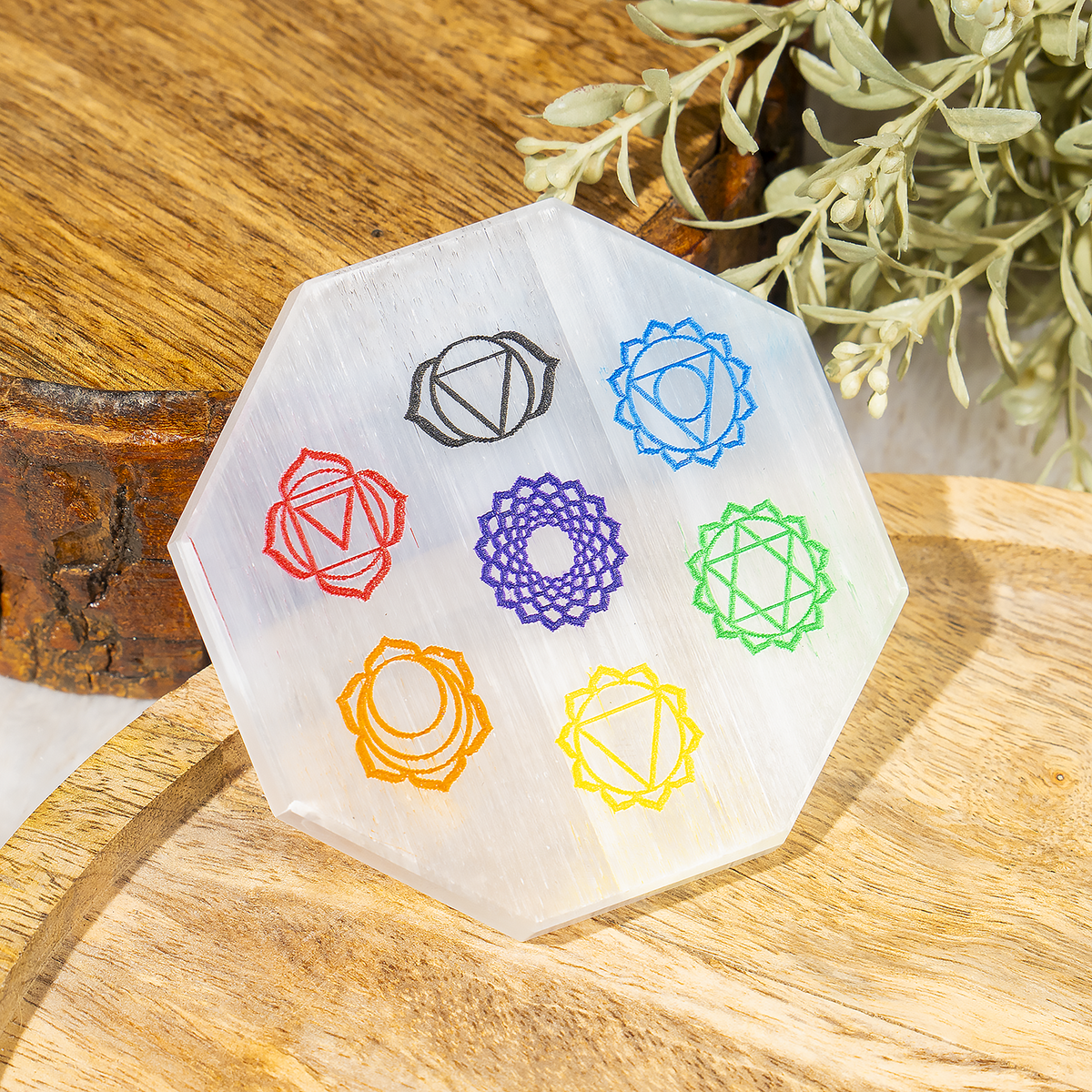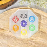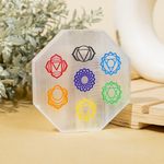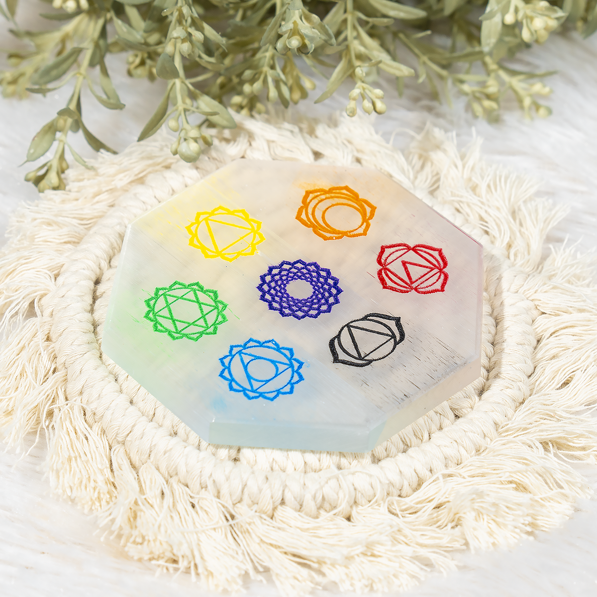 Harness the purifying power of Selenite with this beautifully carved hexagon plate, engraved with the 7 Chakra symbol.