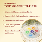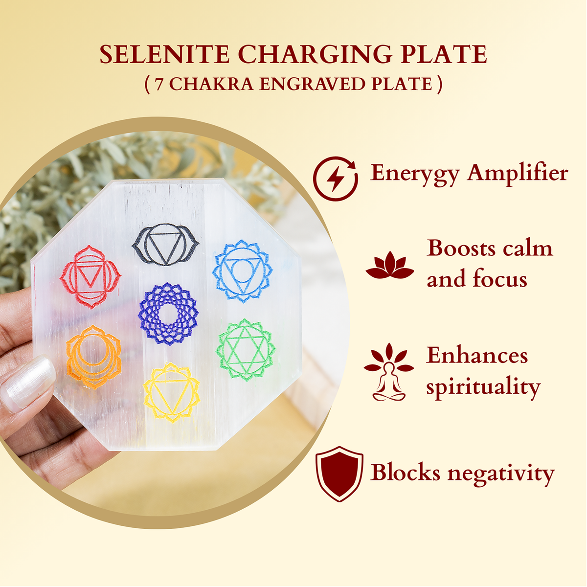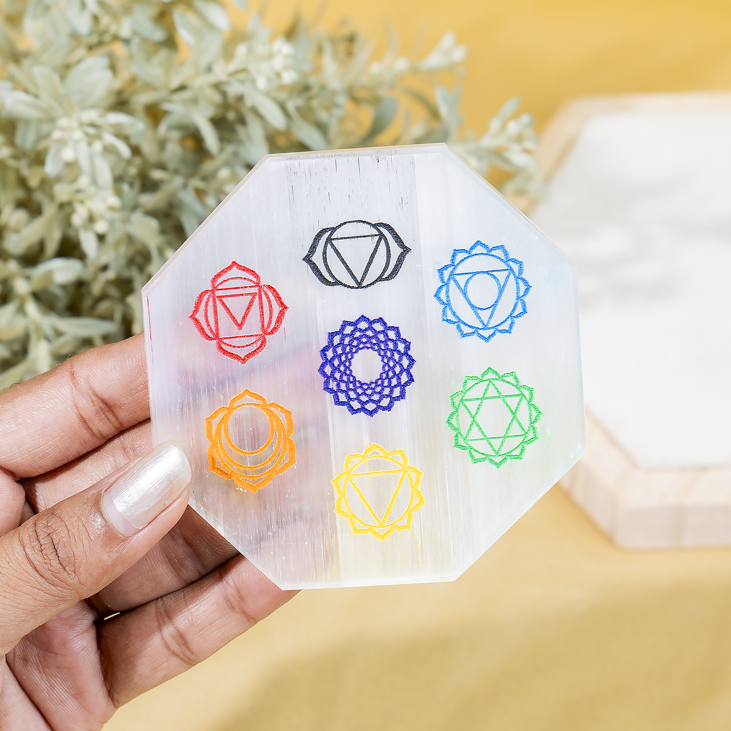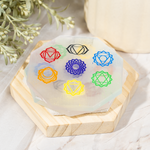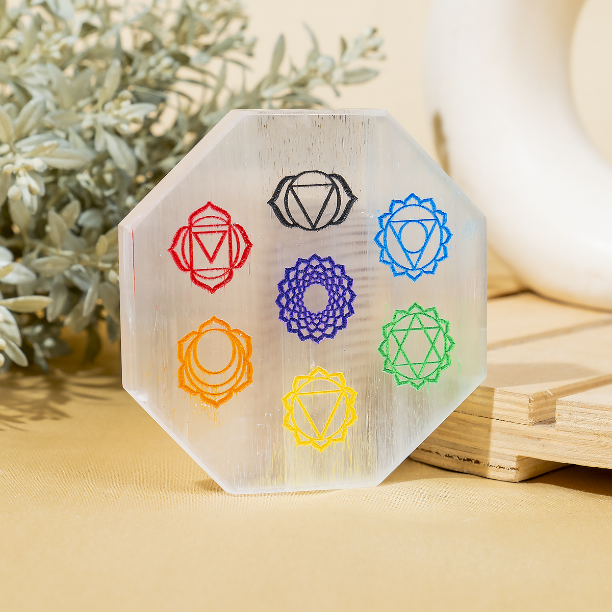 Harness the purifying power of Selenite with this beautifully carved hexagon plate, engraved with the 7 Chakra symbol.
