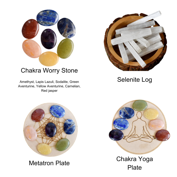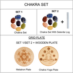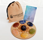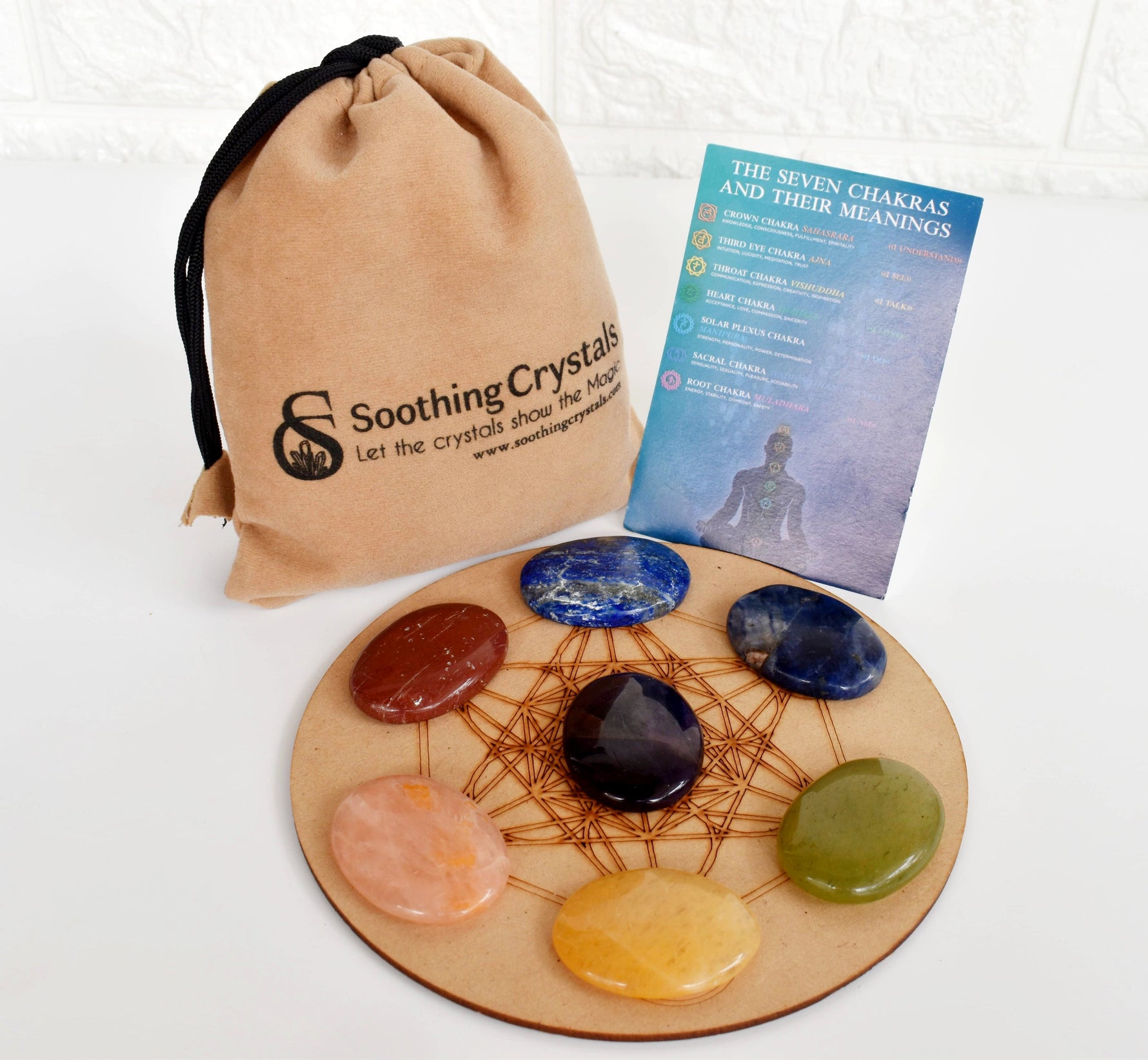 7 Chakra Crystals Worry Stones Set with Wooden Grid Plate, Selenite Log