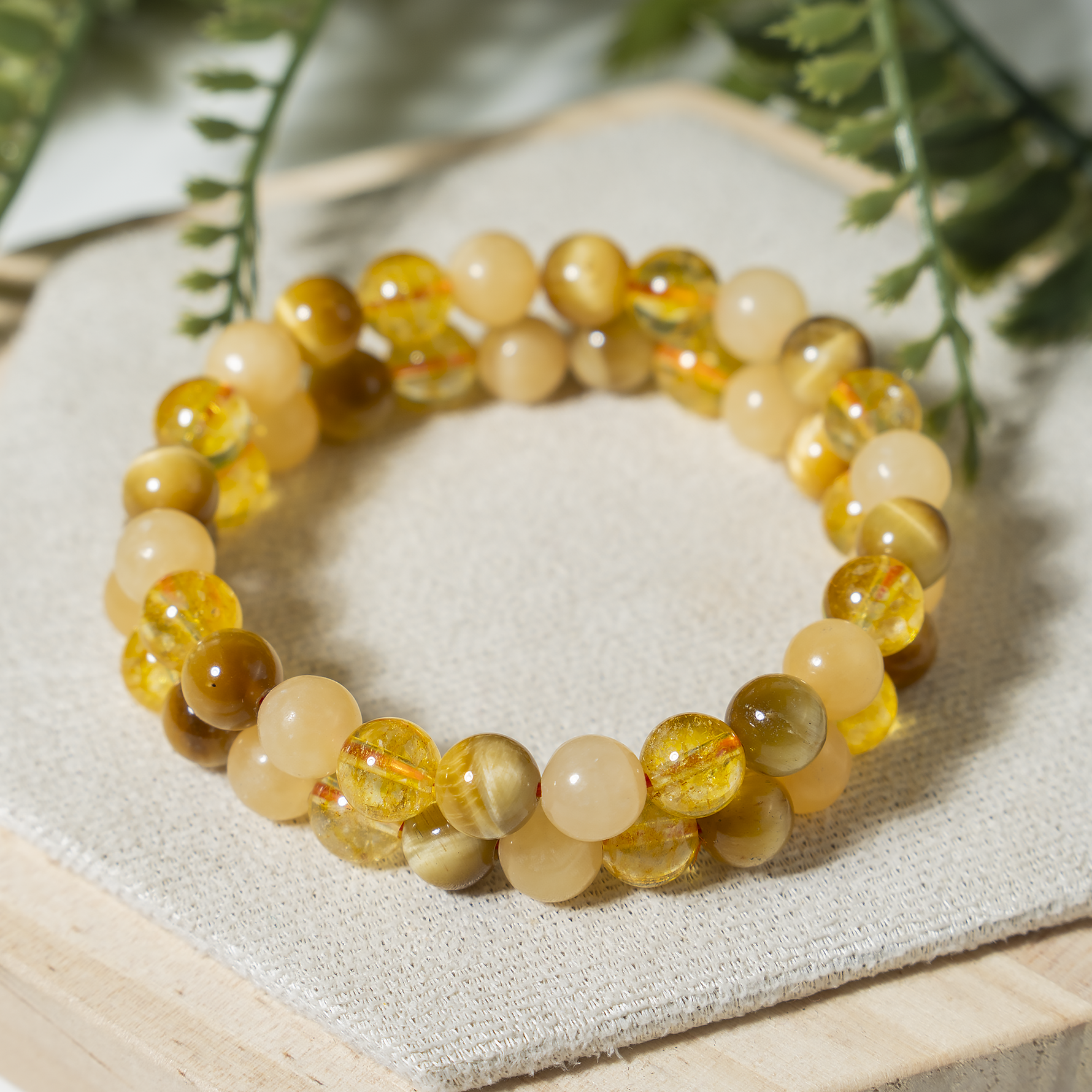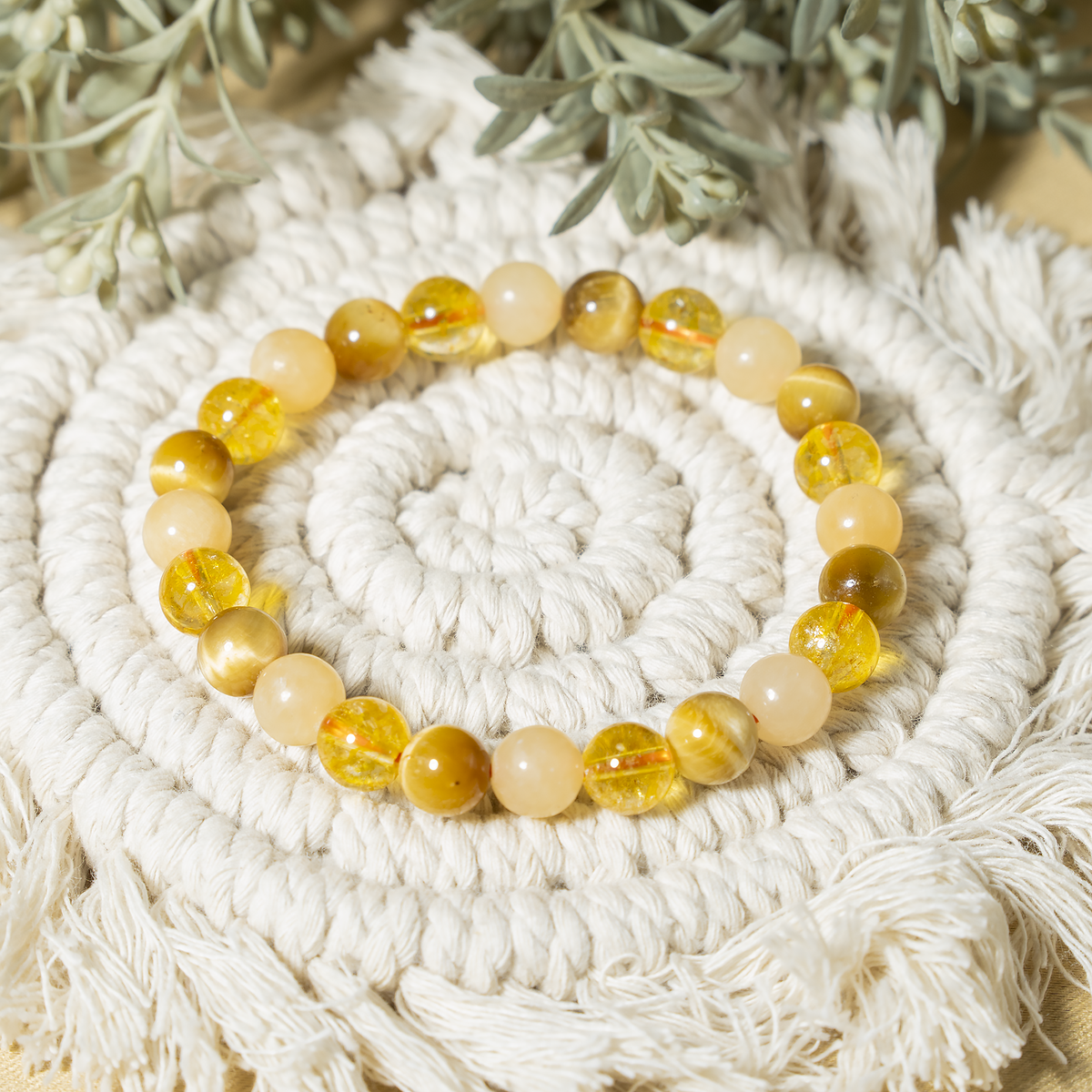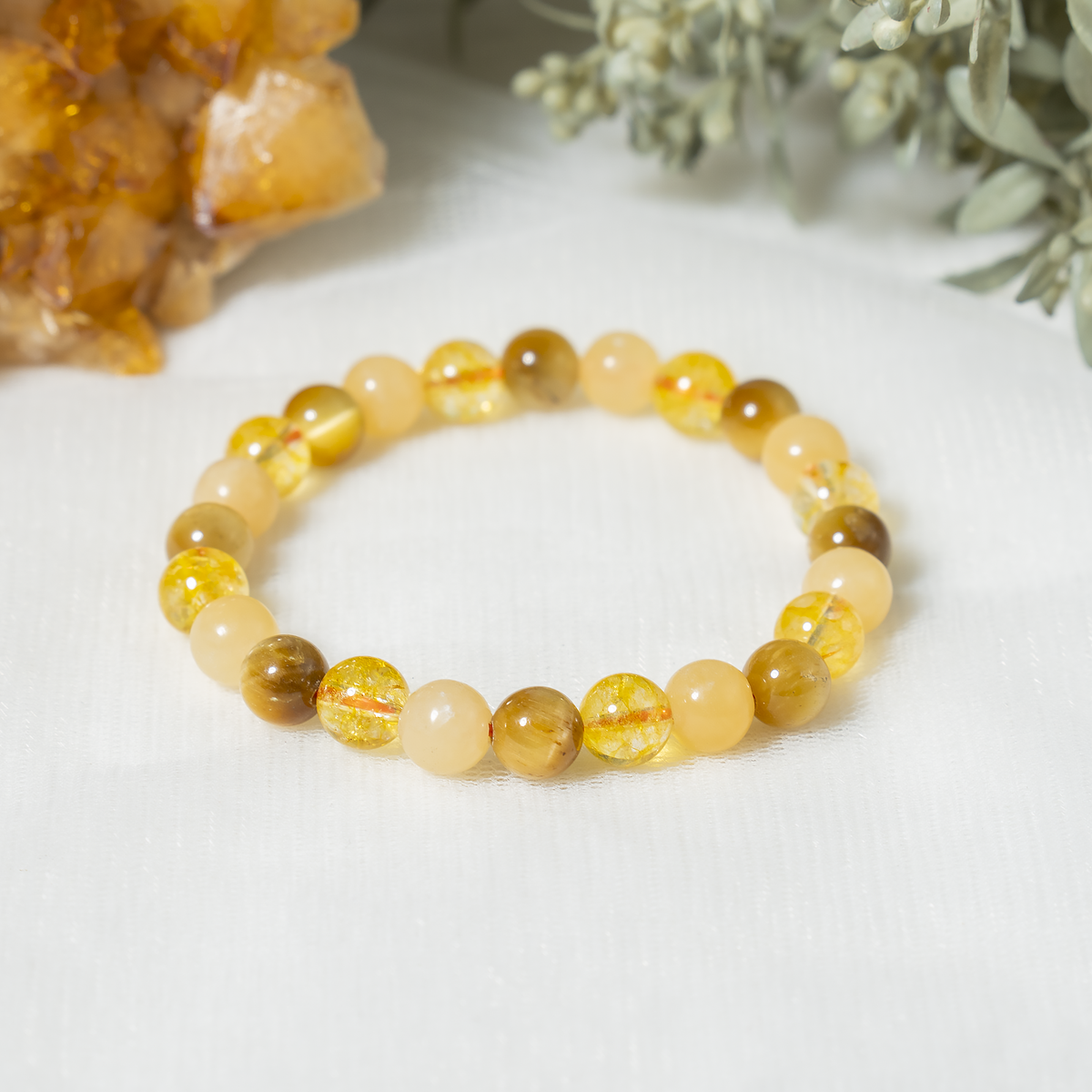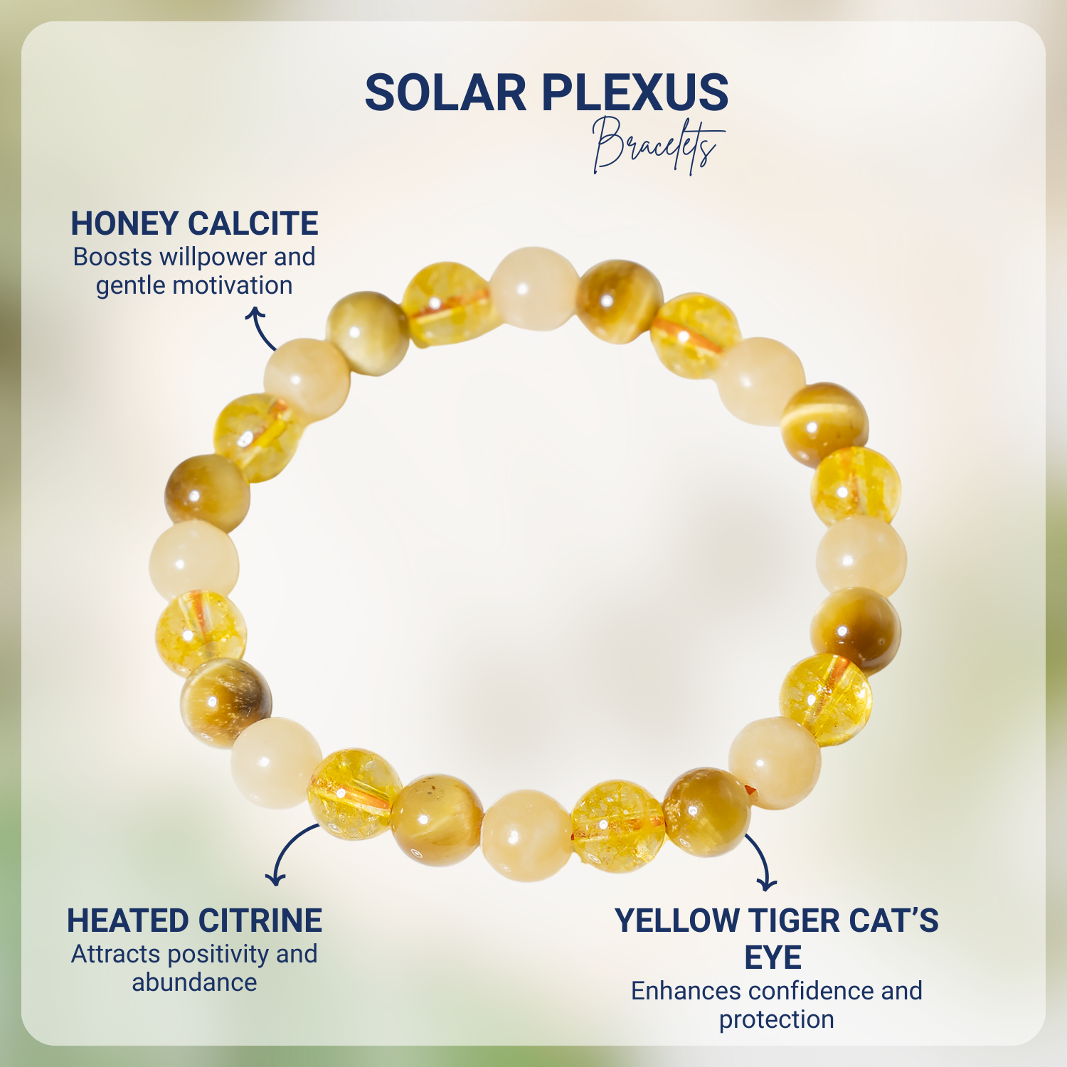 Handcrafted SOLAR PLEXUS Chakra bracelet featuring Citrine, Tiger Cats Eye Yellow, Honey Calcite crystal known for attracting abundance, boosting confidence, and promoting positivity and personal power.