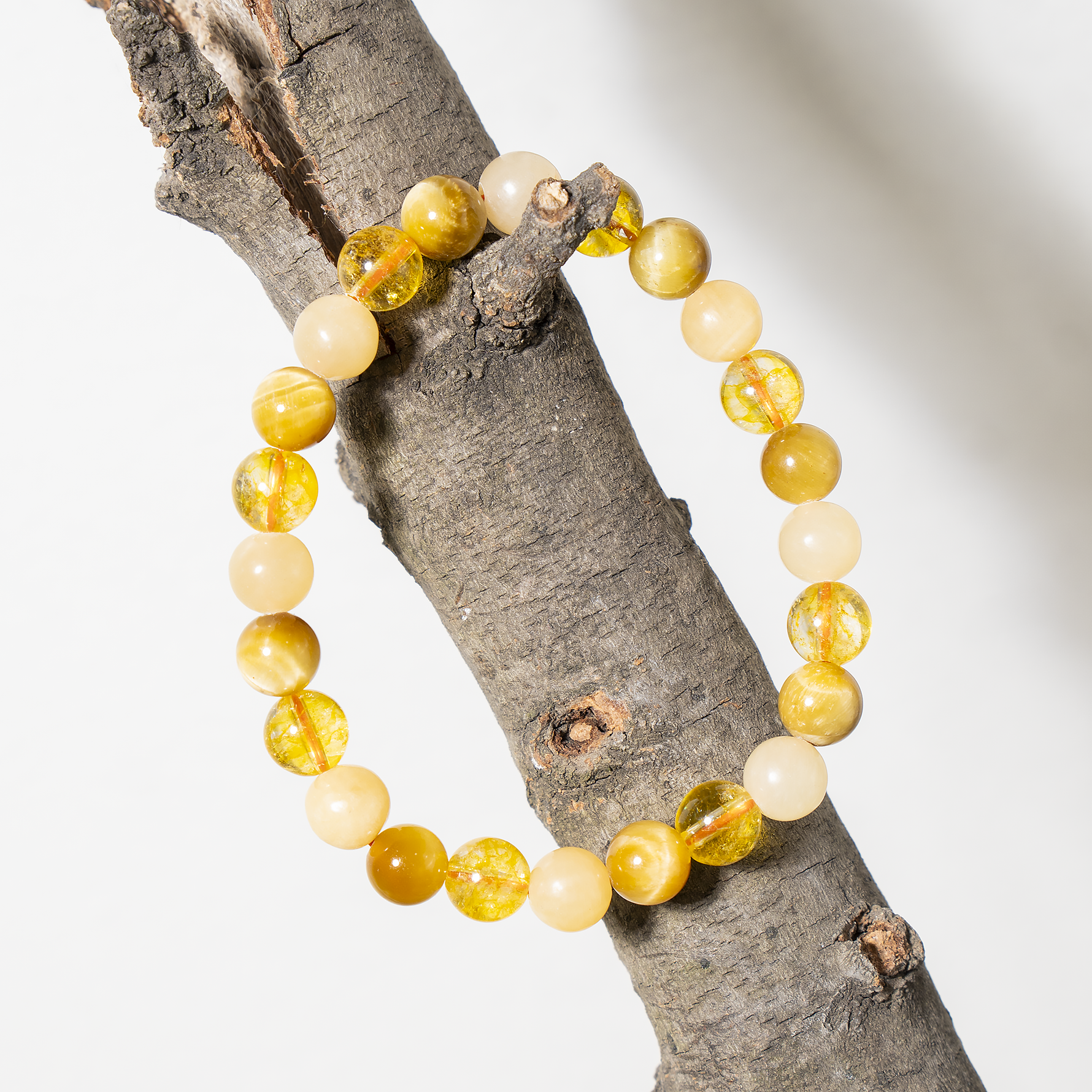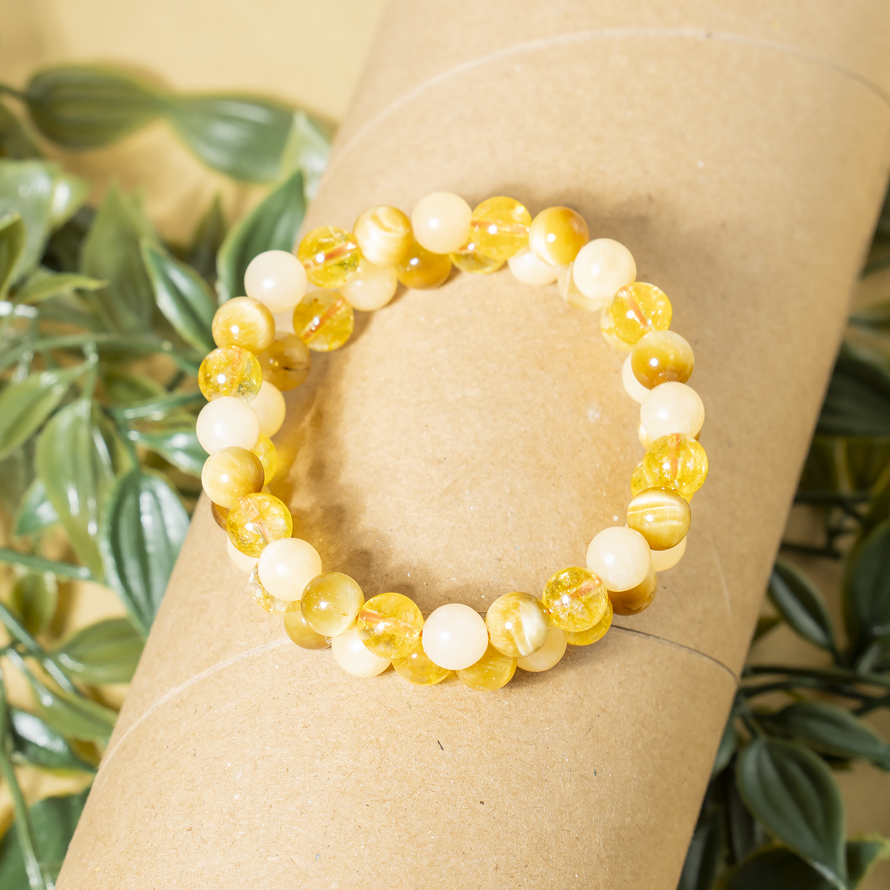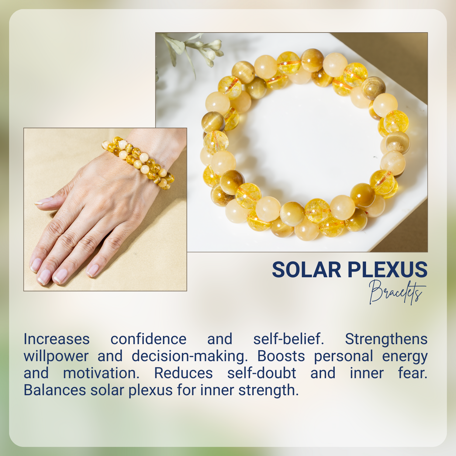 Handcrafted SOLAR PLEXUS Chakra bracelet featuring Citrine, Tiger Cats Eye Yellow, Honey Calcite crystal known for attracting abundance, boosting confidence, and promoting positivity and personal power.