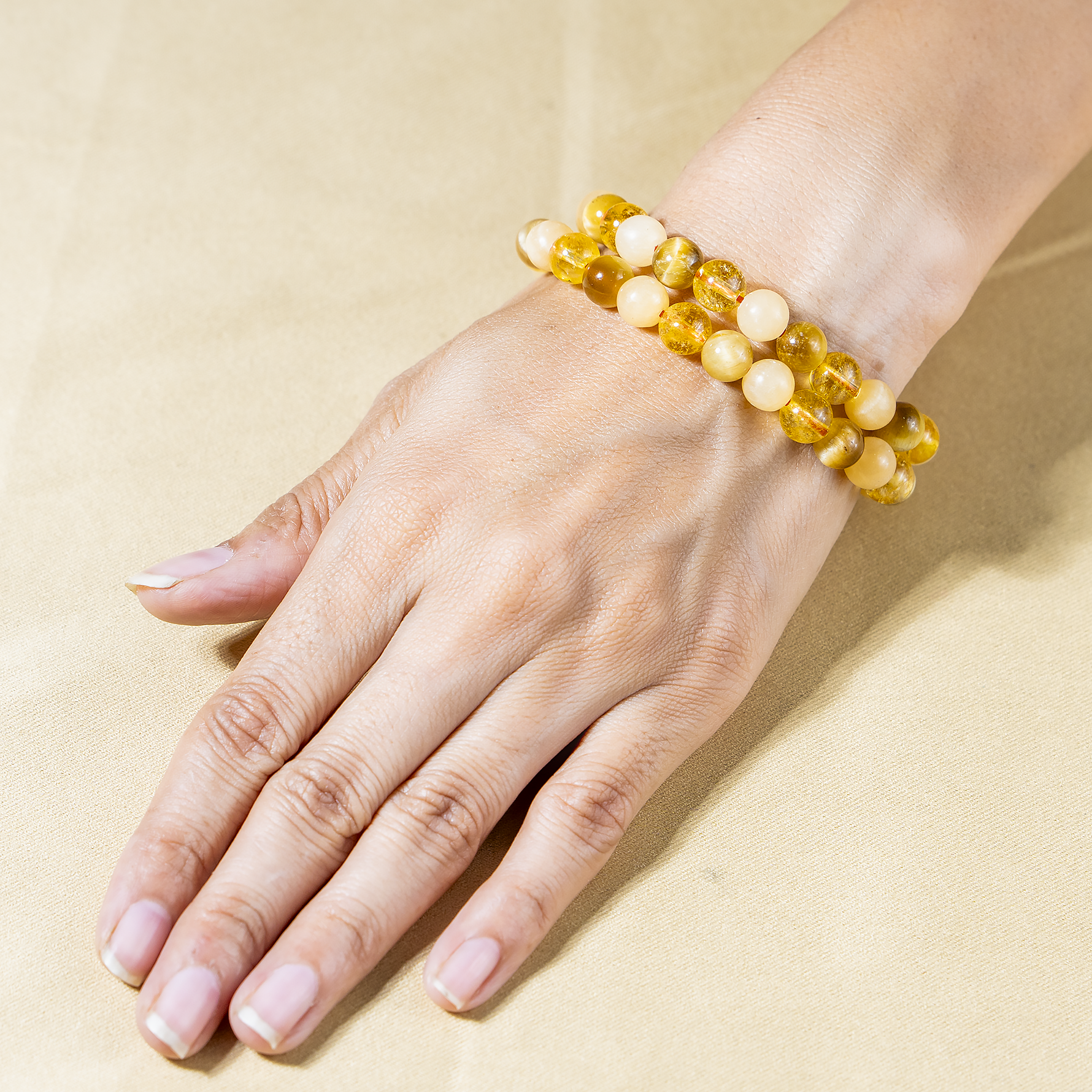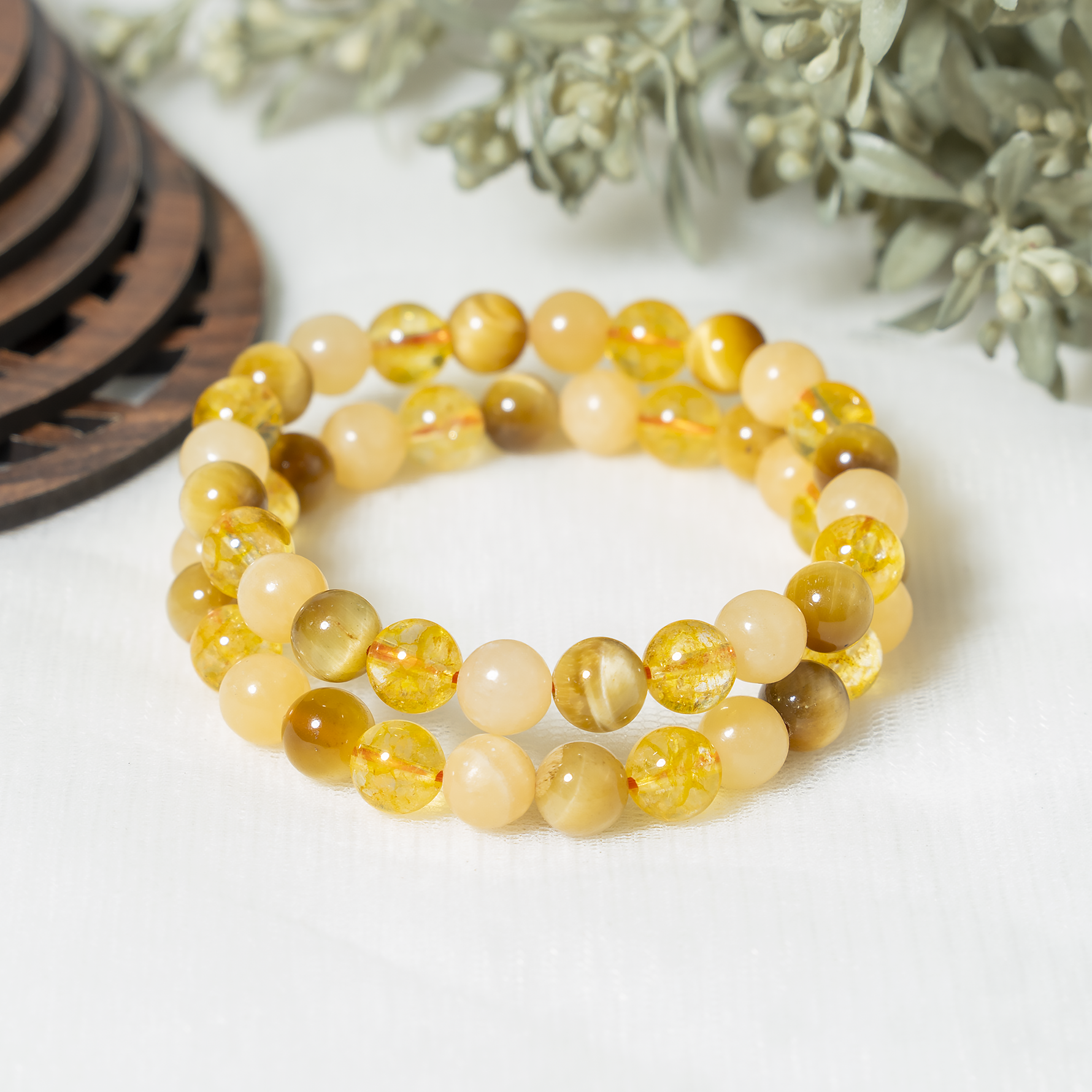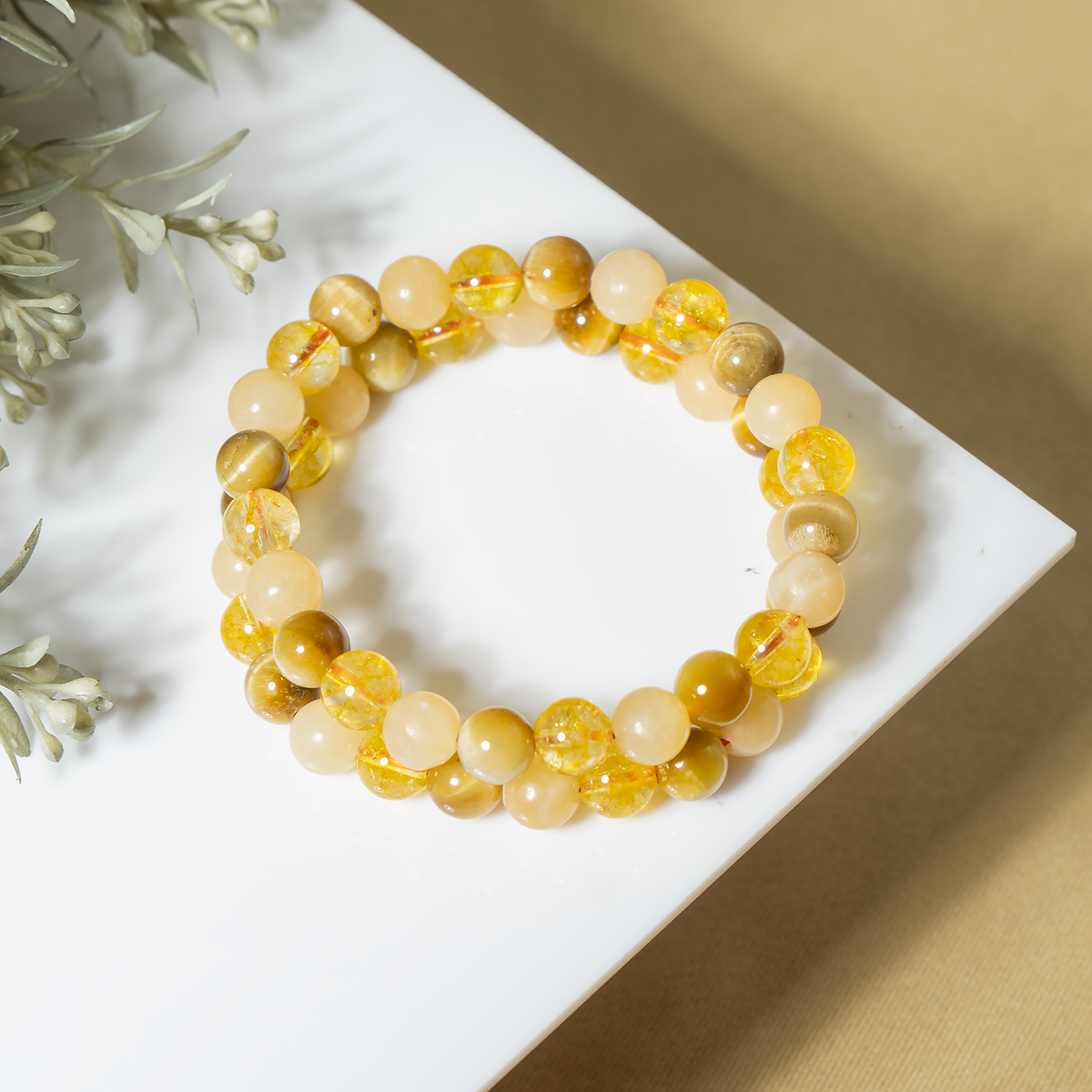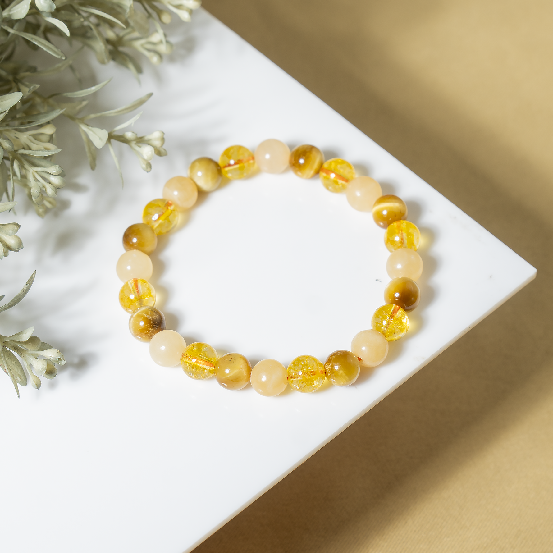 Handcrafted SOLAR PLEXUS Chakra bracelet featuring Citrine, Tiger Cats Eye Yellow, Honey Calcite crystal known for attracting abundance, boosting confidence, and promoting positivity and personal power.